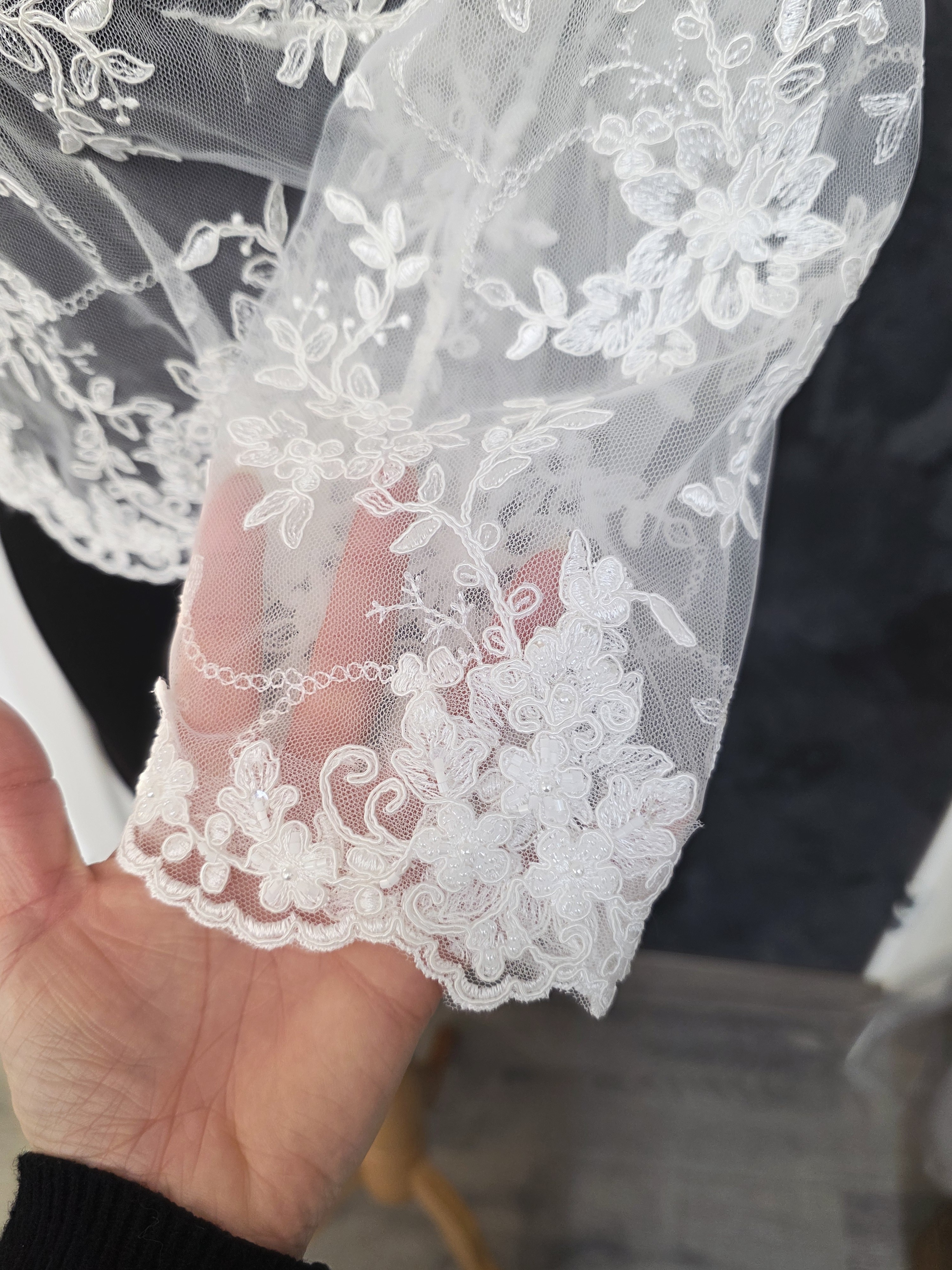 La dentelle florale richement brodée apporte une touche raffinée et intemporelle, tandis que les manches 3/4 en transparence ajoutent douceur et féminité.