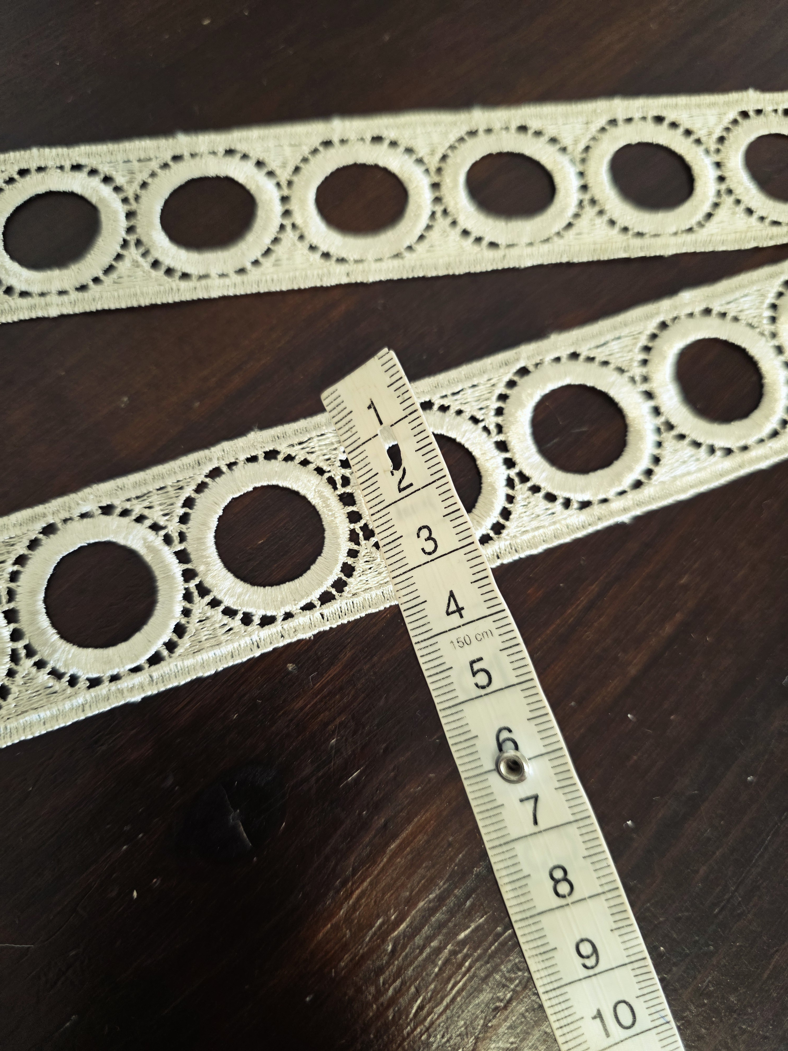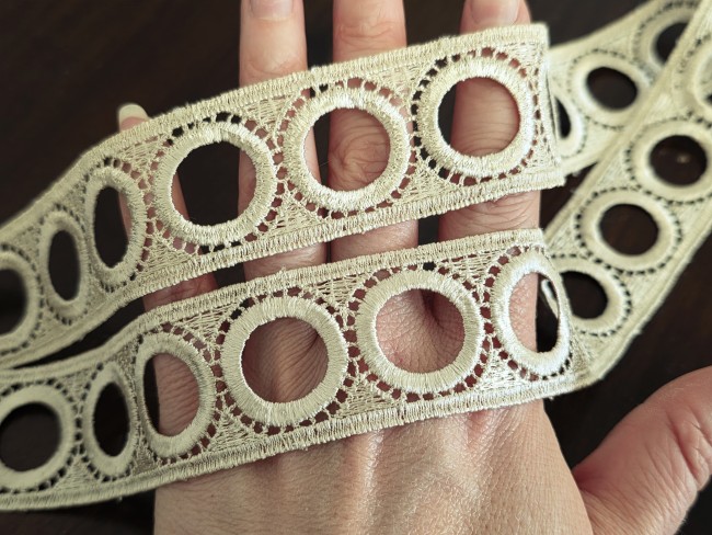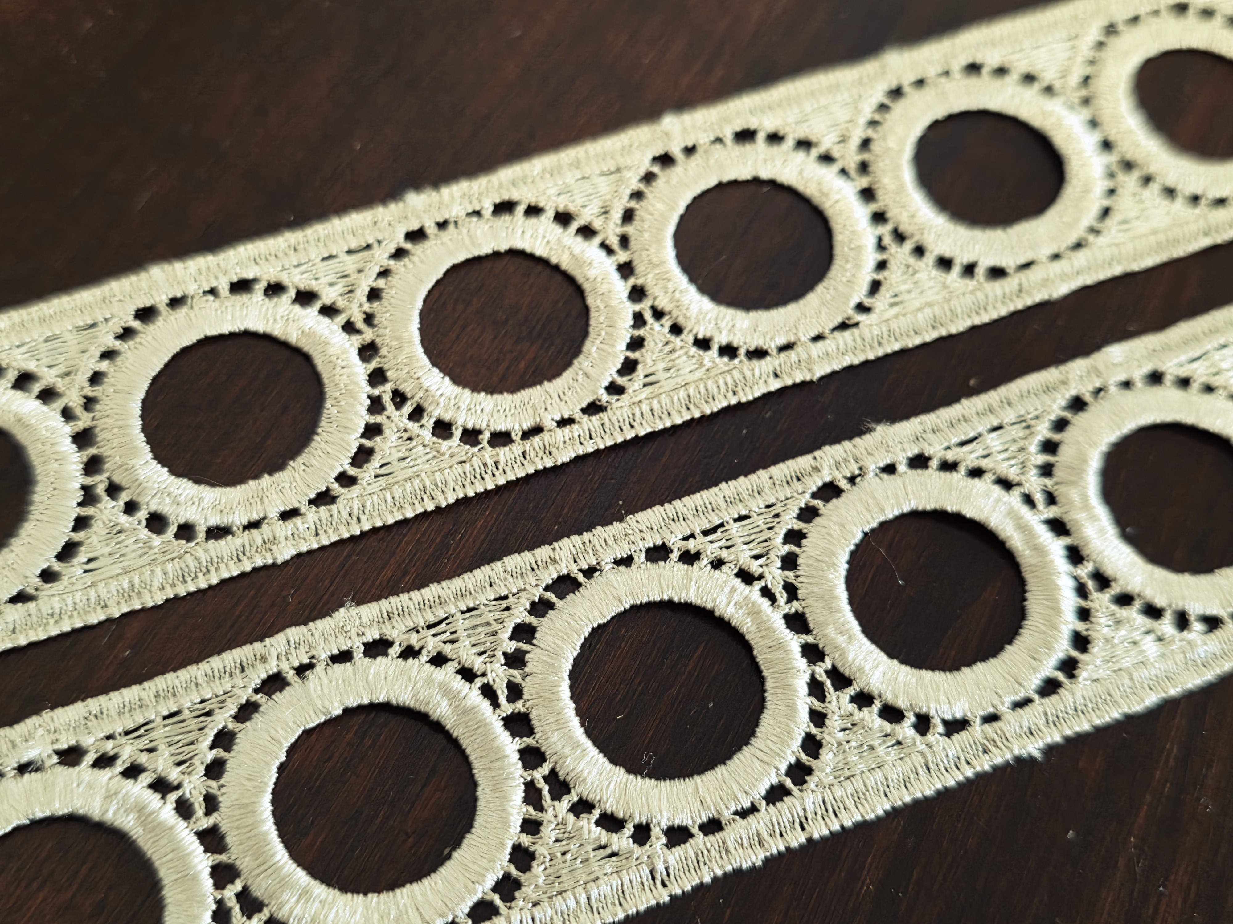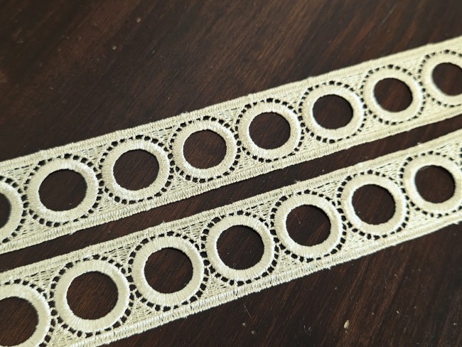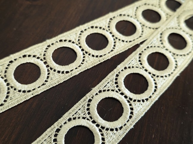 Apportez une touche élégante et originale à vos créations avec ce galon dentelle doré ajouré à motifs cercles.