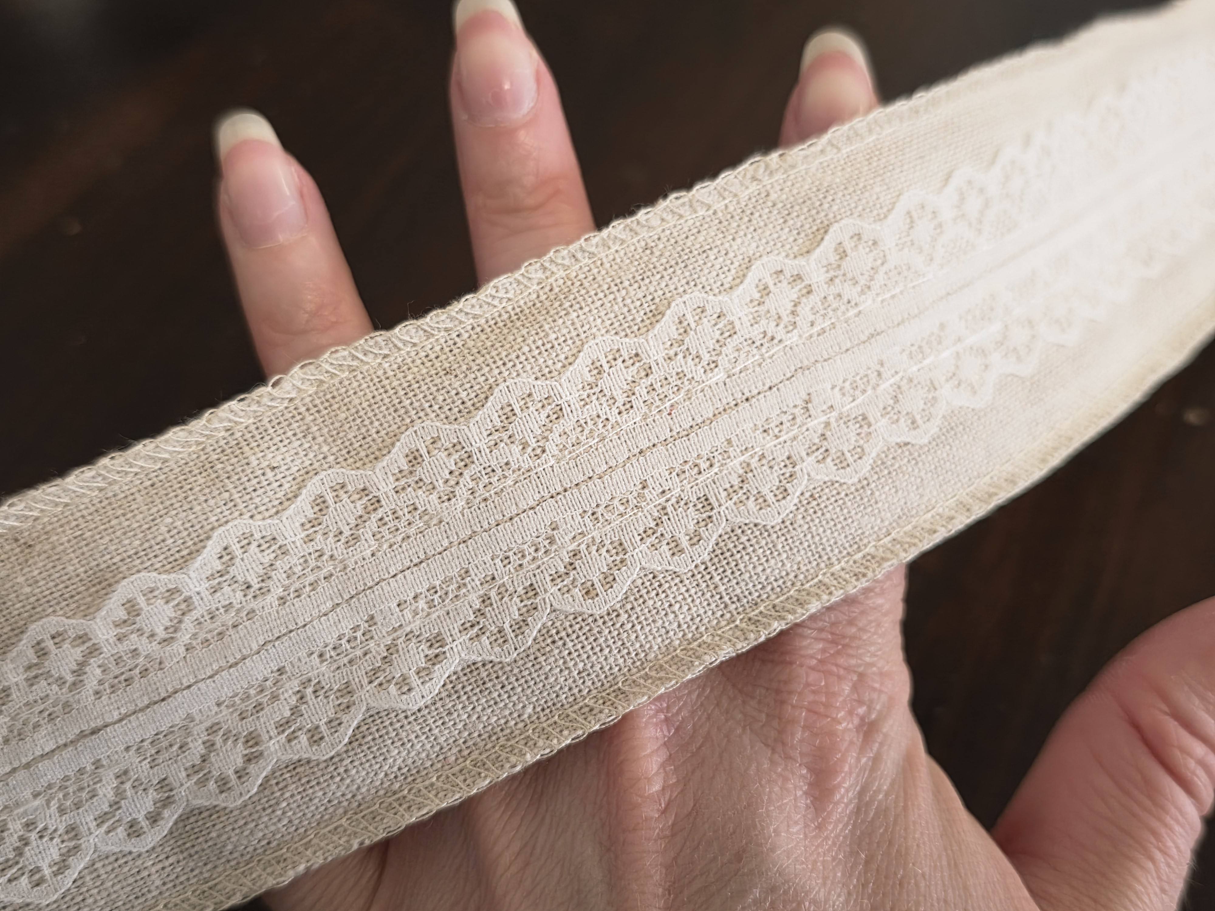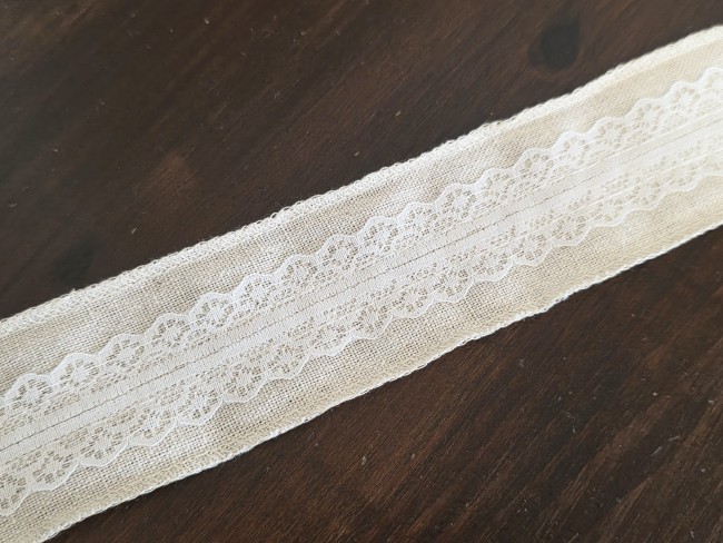 Apportez une touche naturelle et authentique à vos créations avec ce galon en lin et coton ivoire, délicatement orné d’une dentelle fine.