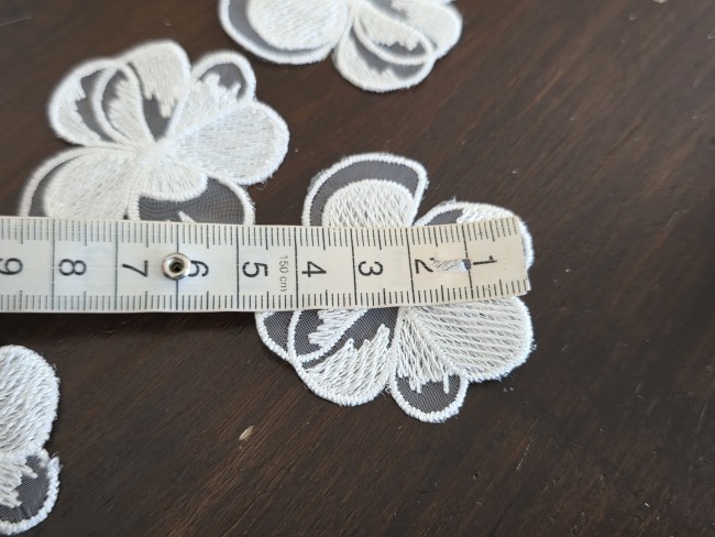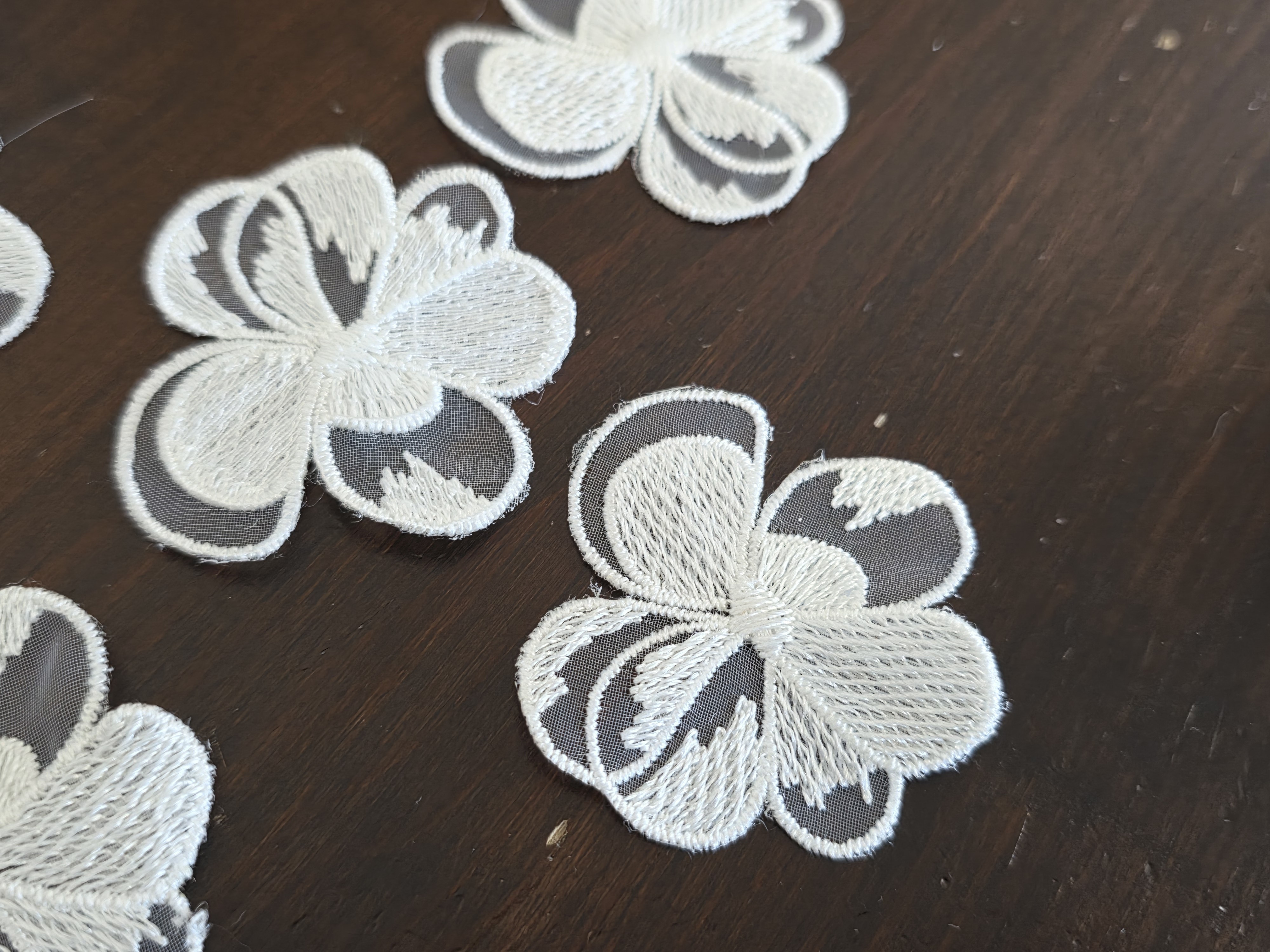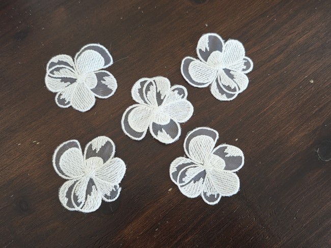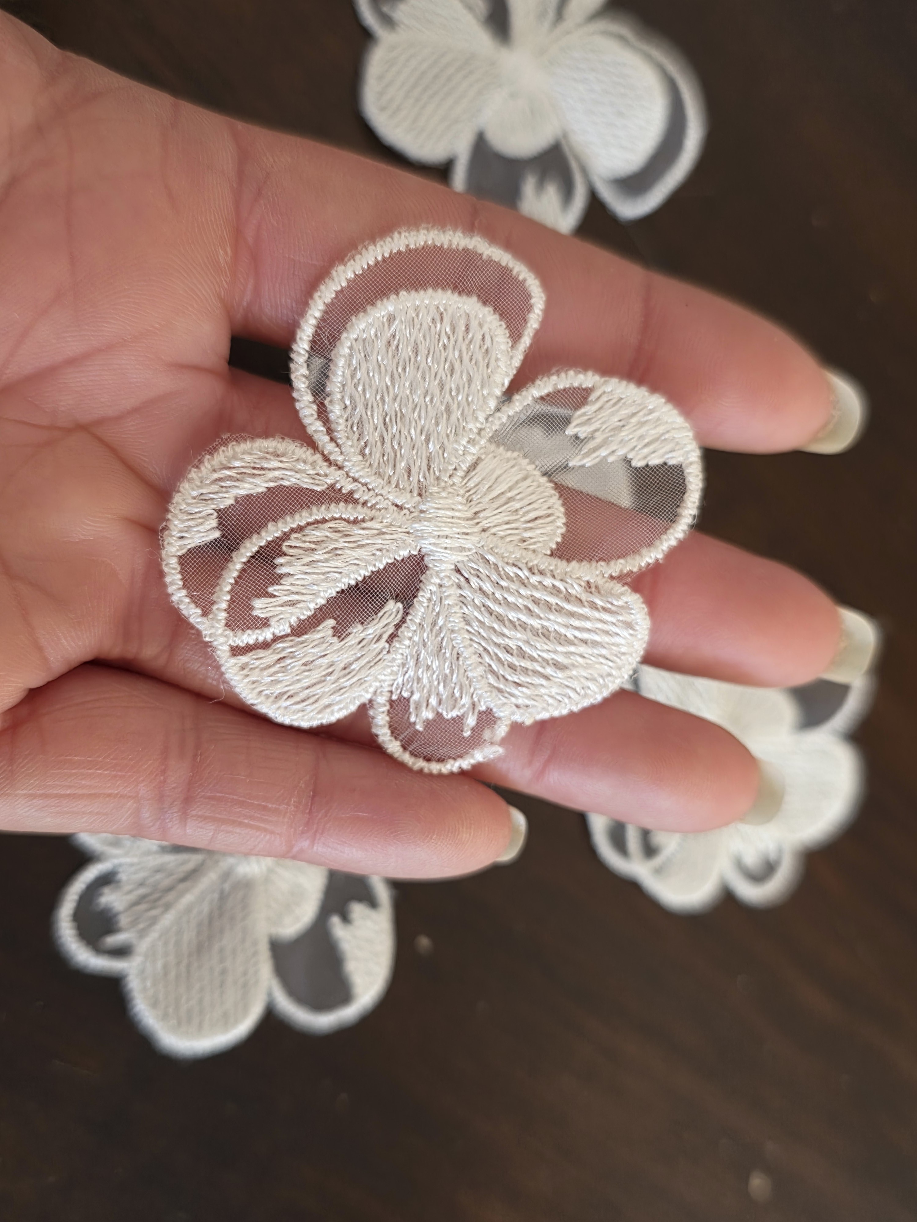 Lot de 5 fleurs en dentelle ivoire clair, brodées sur tulle fin avec un joli effet de relief. Leur motif floral légèrement plus dense apporte du volume et un rendu raffiné, idéal pour sublimer vos créations couture.