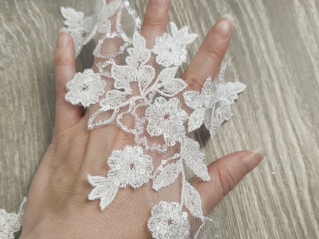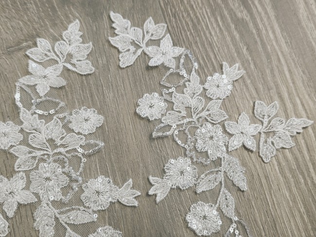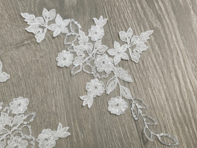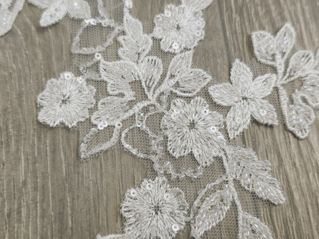Appliqué en dentelle ivoire clair au motif floral et feuillage délicatement brodé, sublimé par des perles et sequins pour un effet lumineux et élégant. Sa taille plus compacte le rend idéal pour des placements précis et raffinés sur vos créations.