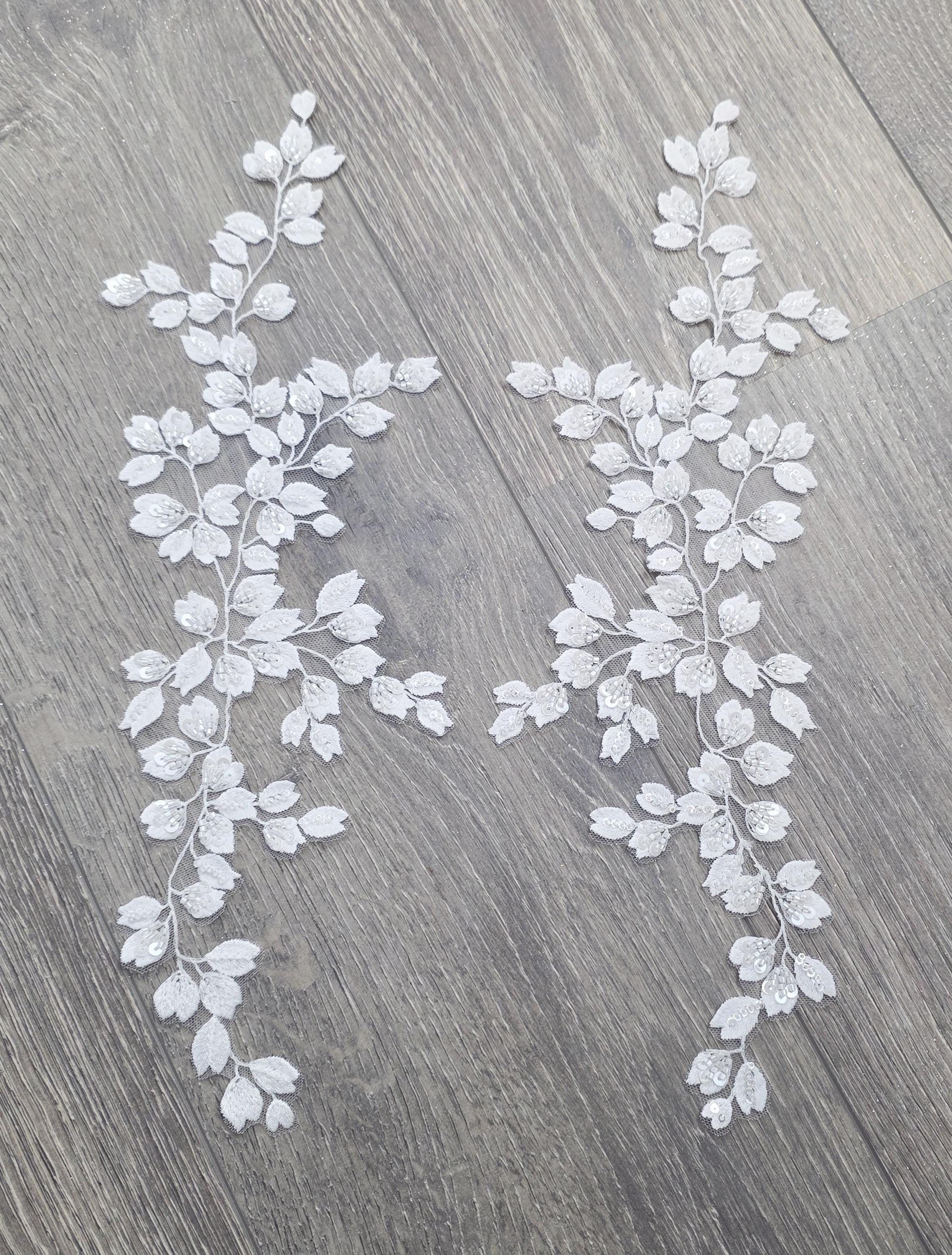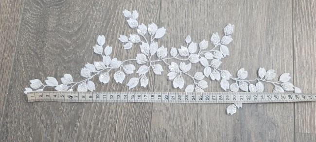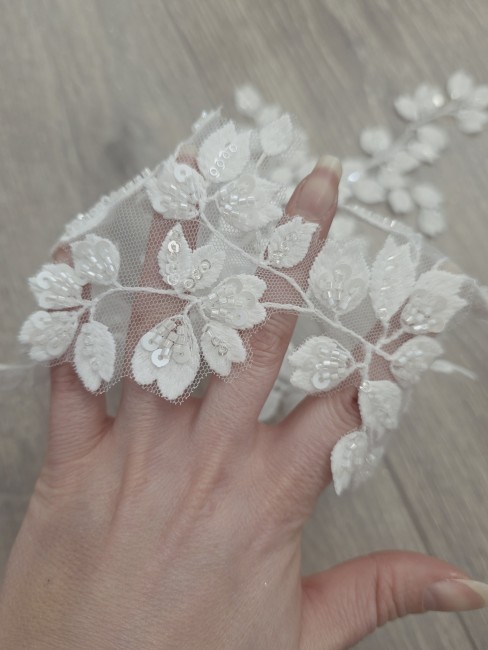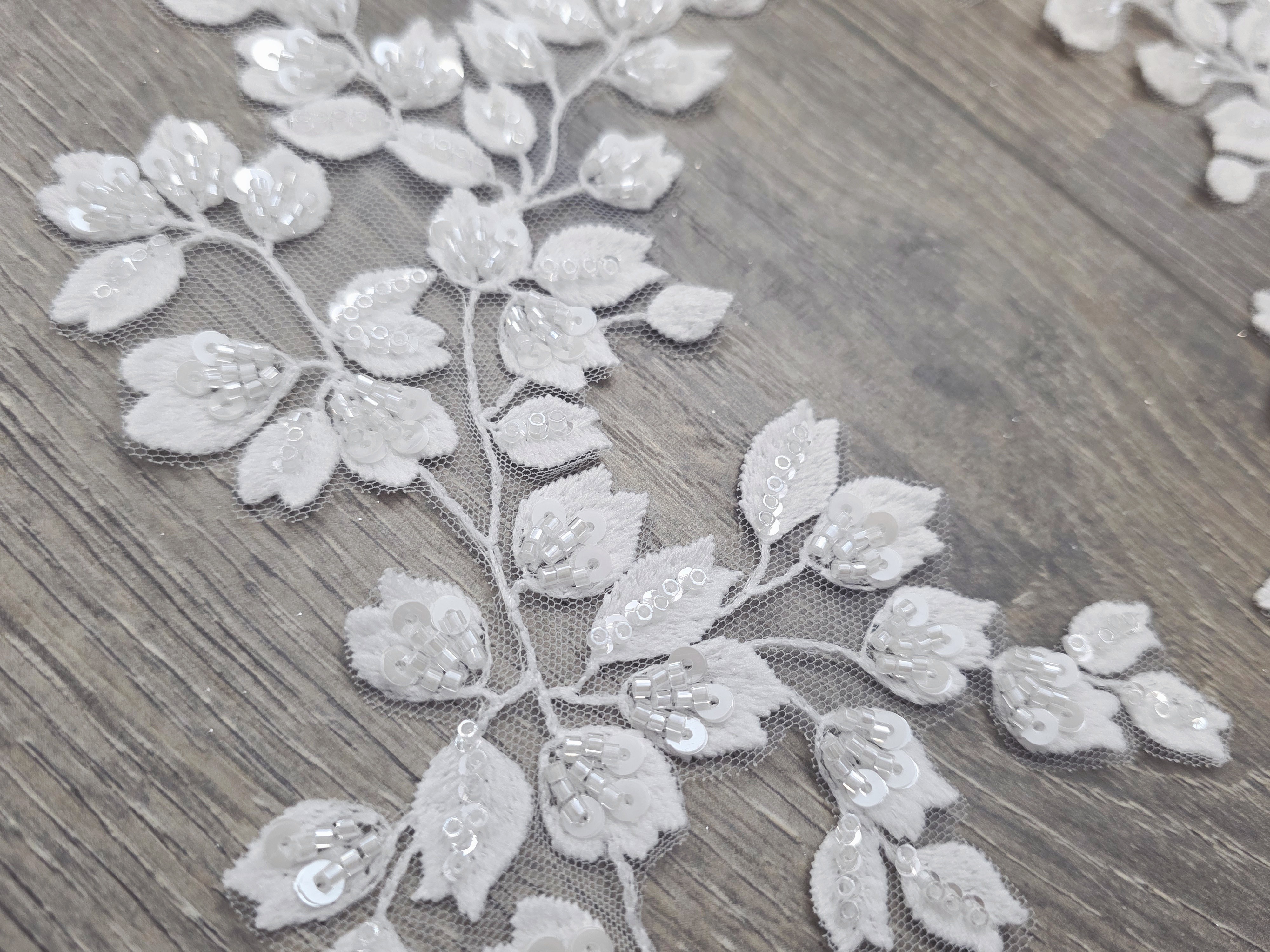 Son motif végétal composé de petites feuilles et boutons de fleurs est sublimé par des perles et sequins cousus, offrant un rendu lumineux et raffiné, idéal pour les robes de mariée, accessoires ou projets couture haut de gamme.