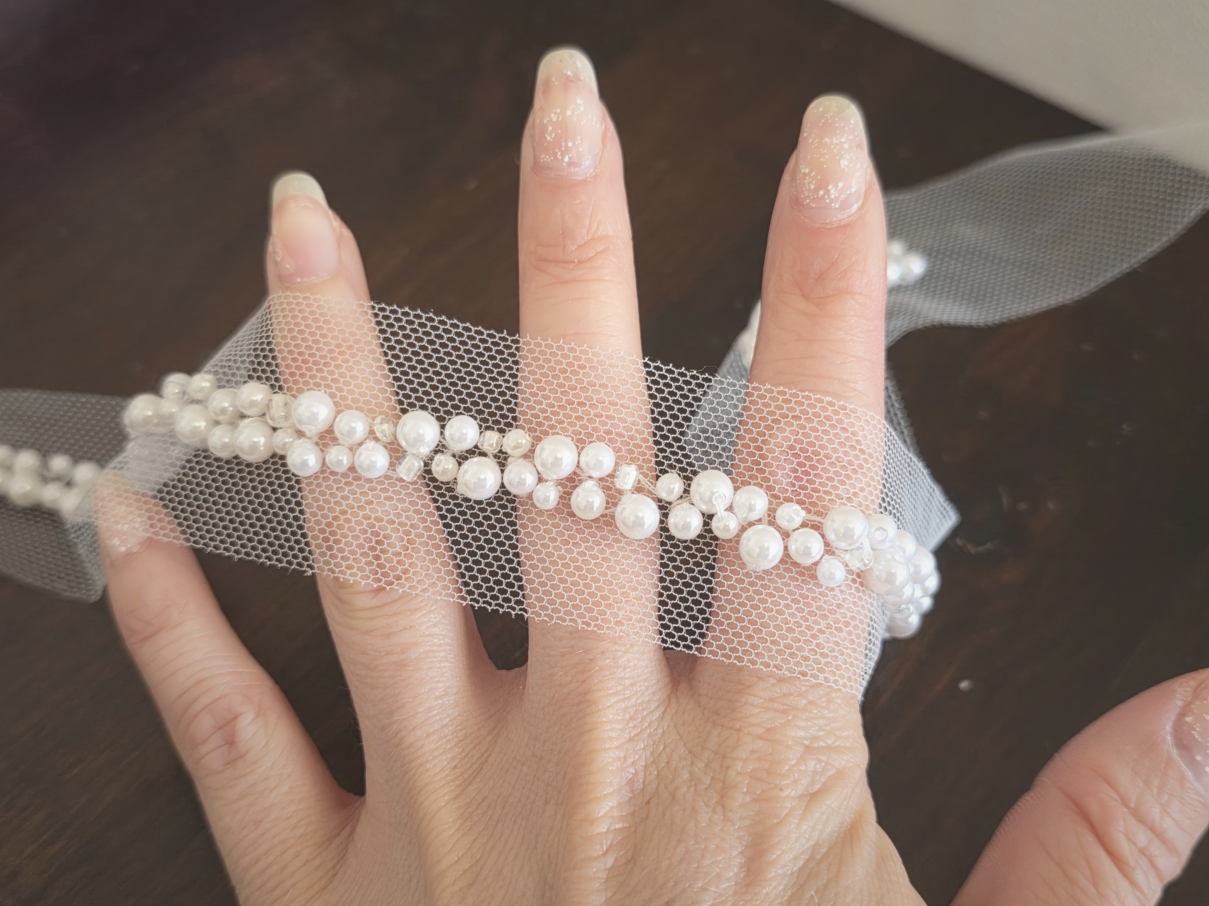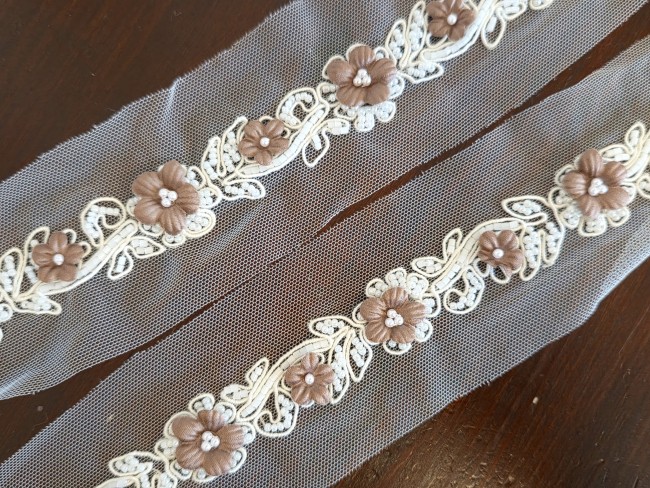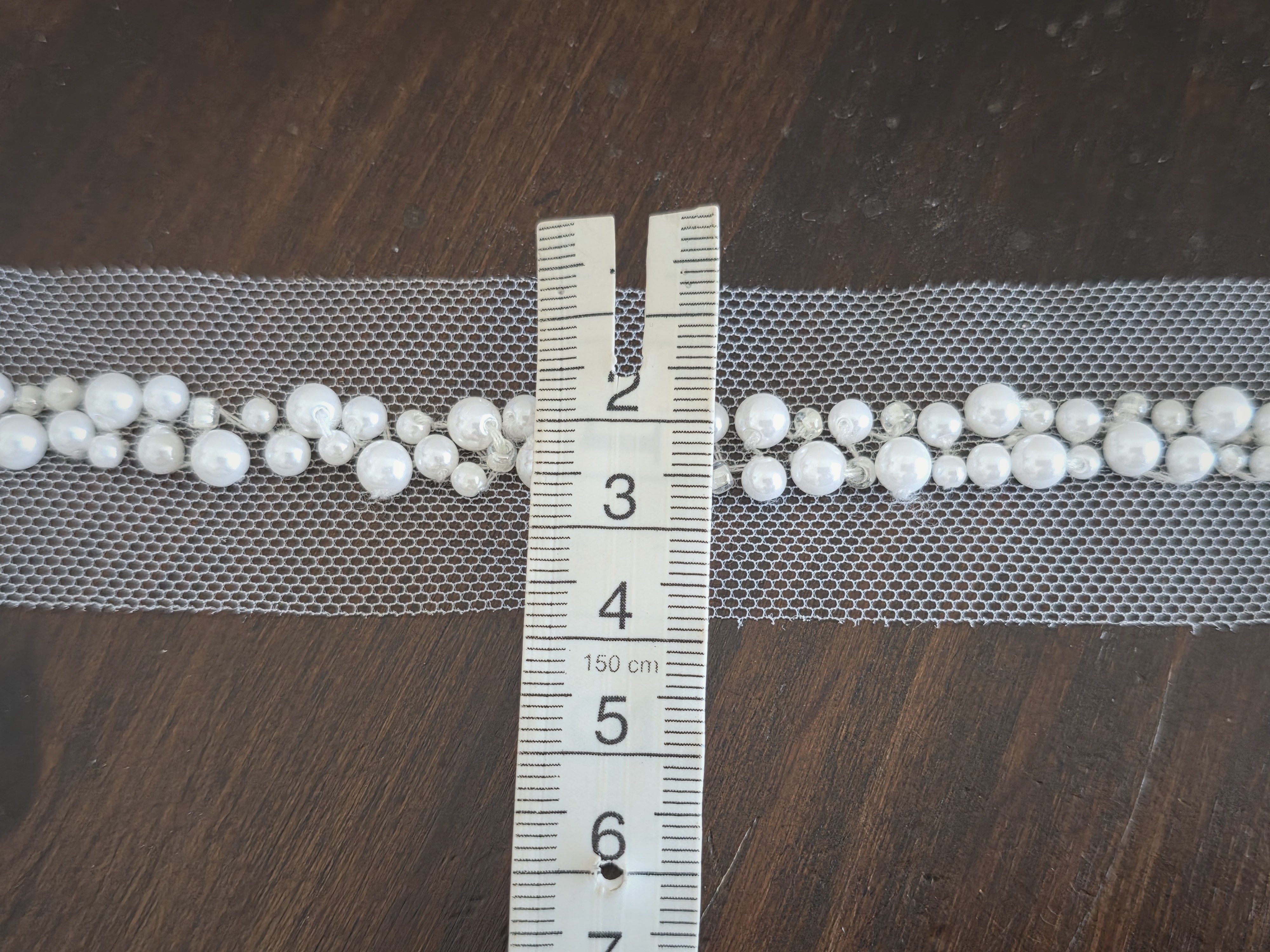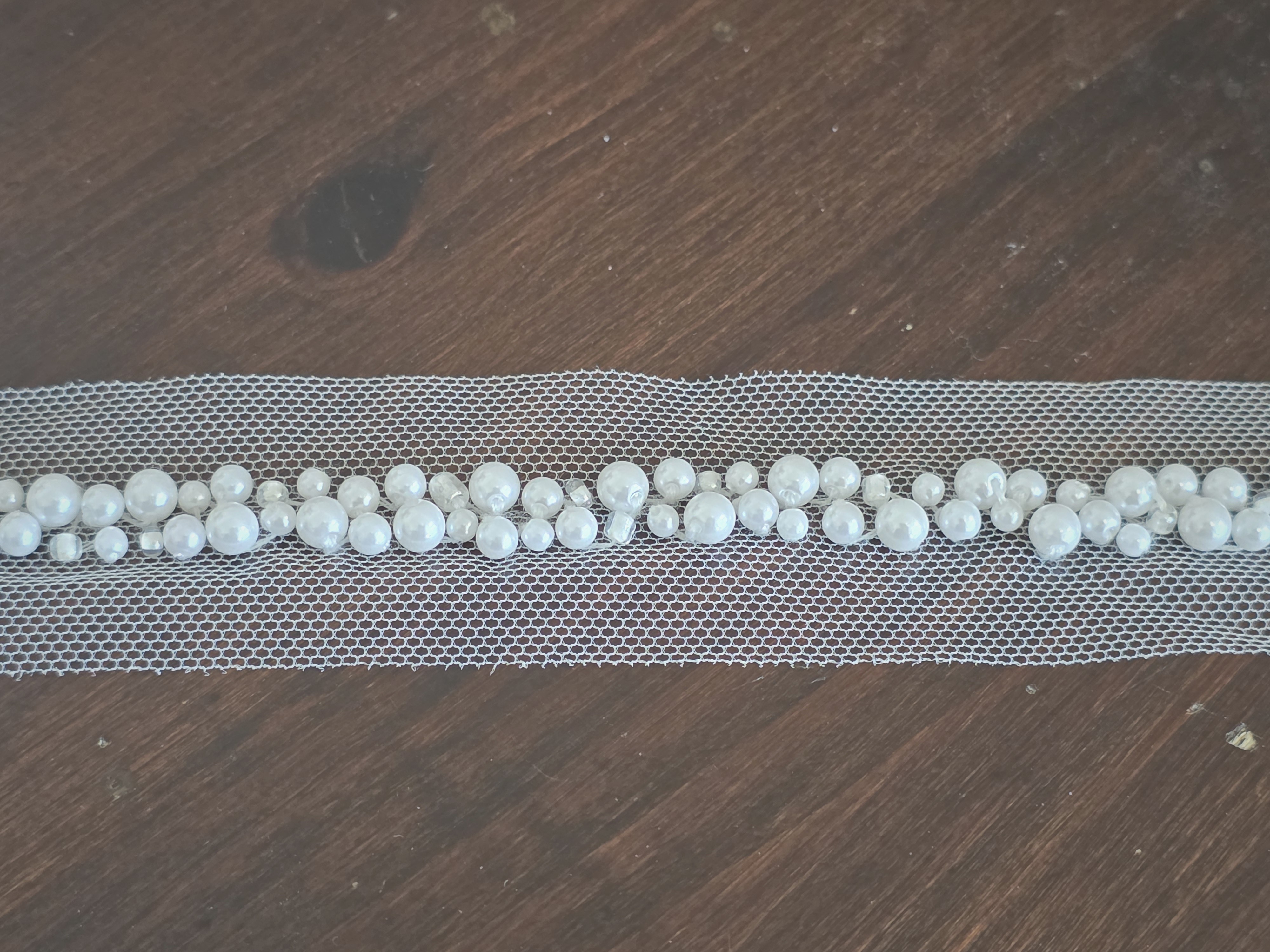 Monté sur une base en tulle fin, ce galon associe différentes tailles de perles pour un rendu lumineux et sophistiqué.