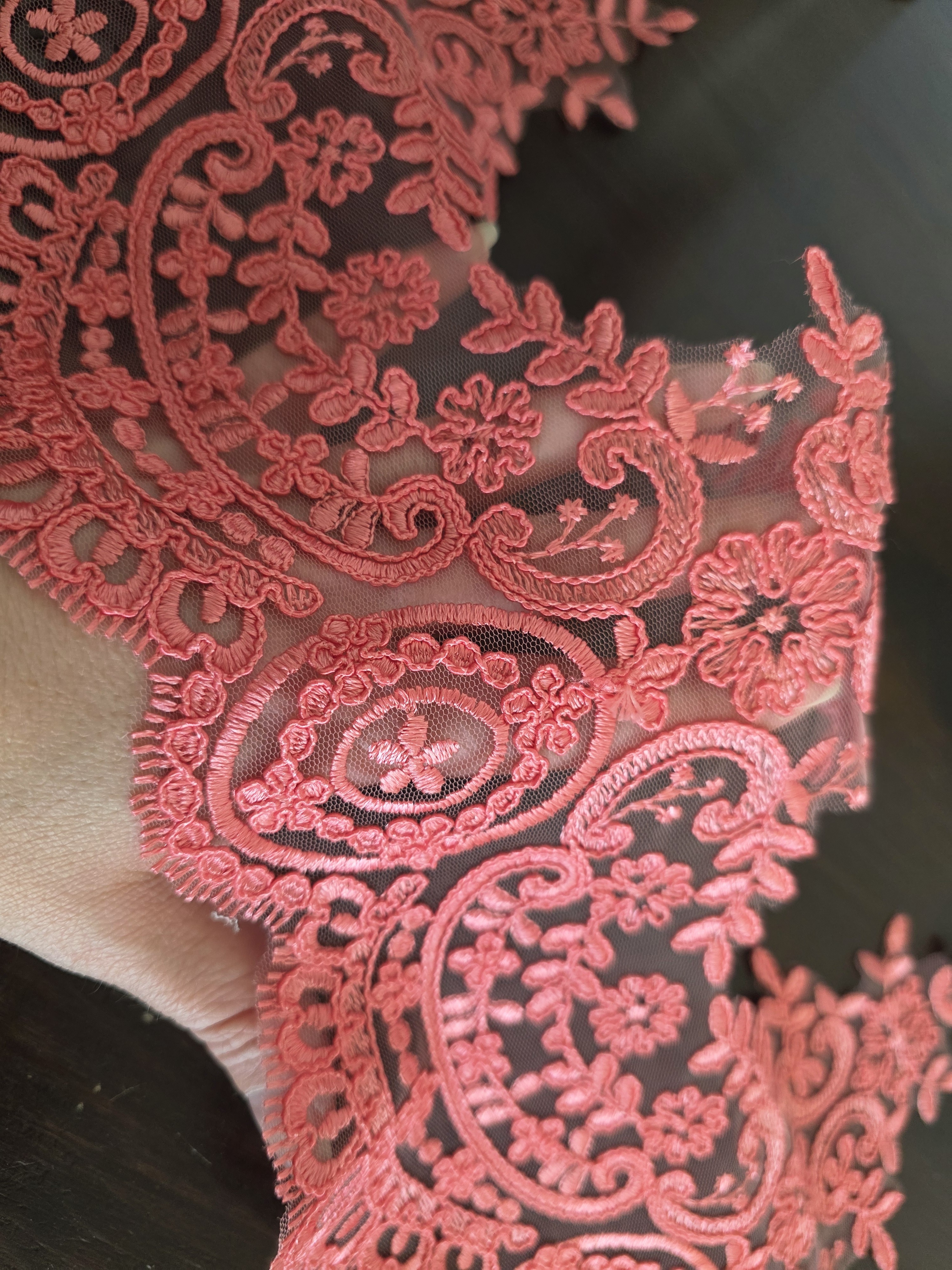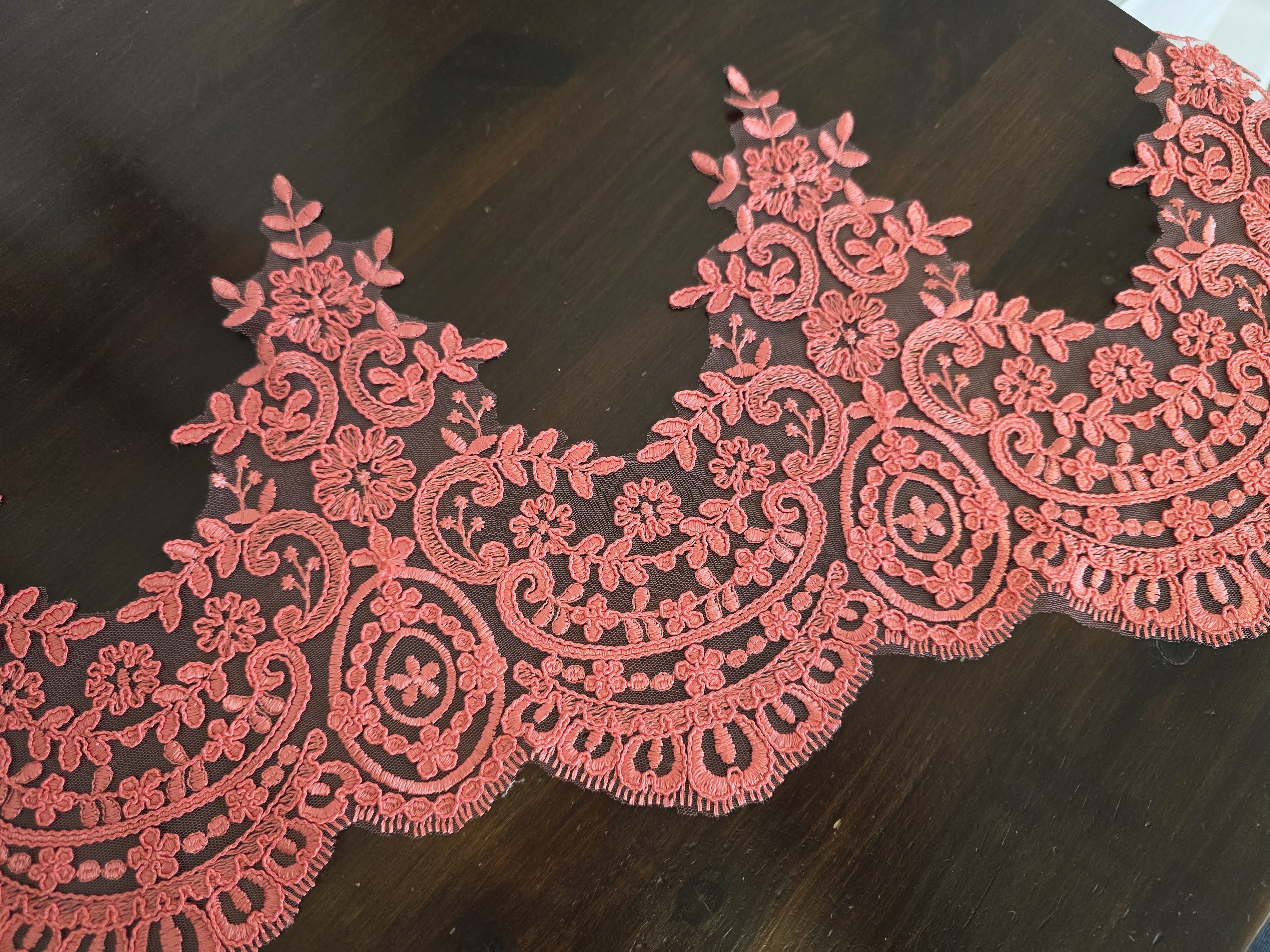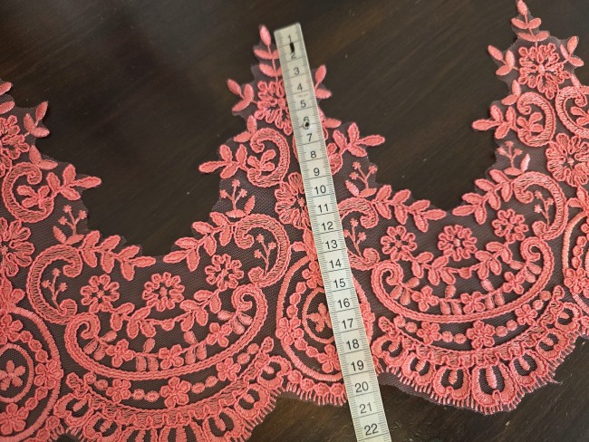 Apportez du caractère et une touche raffinée à vos créations avec cette magnifique dentelle brodée corail sur tulle.