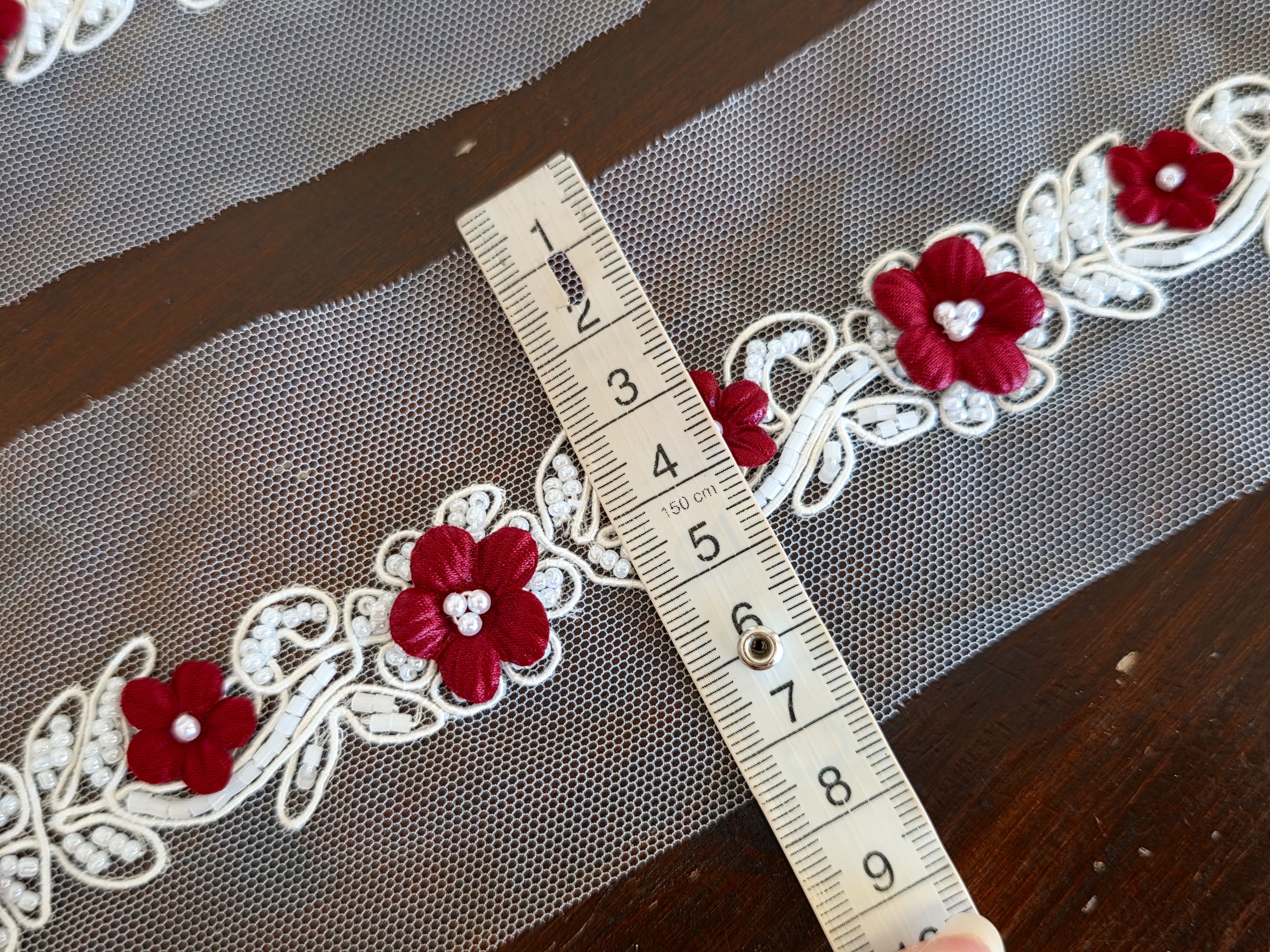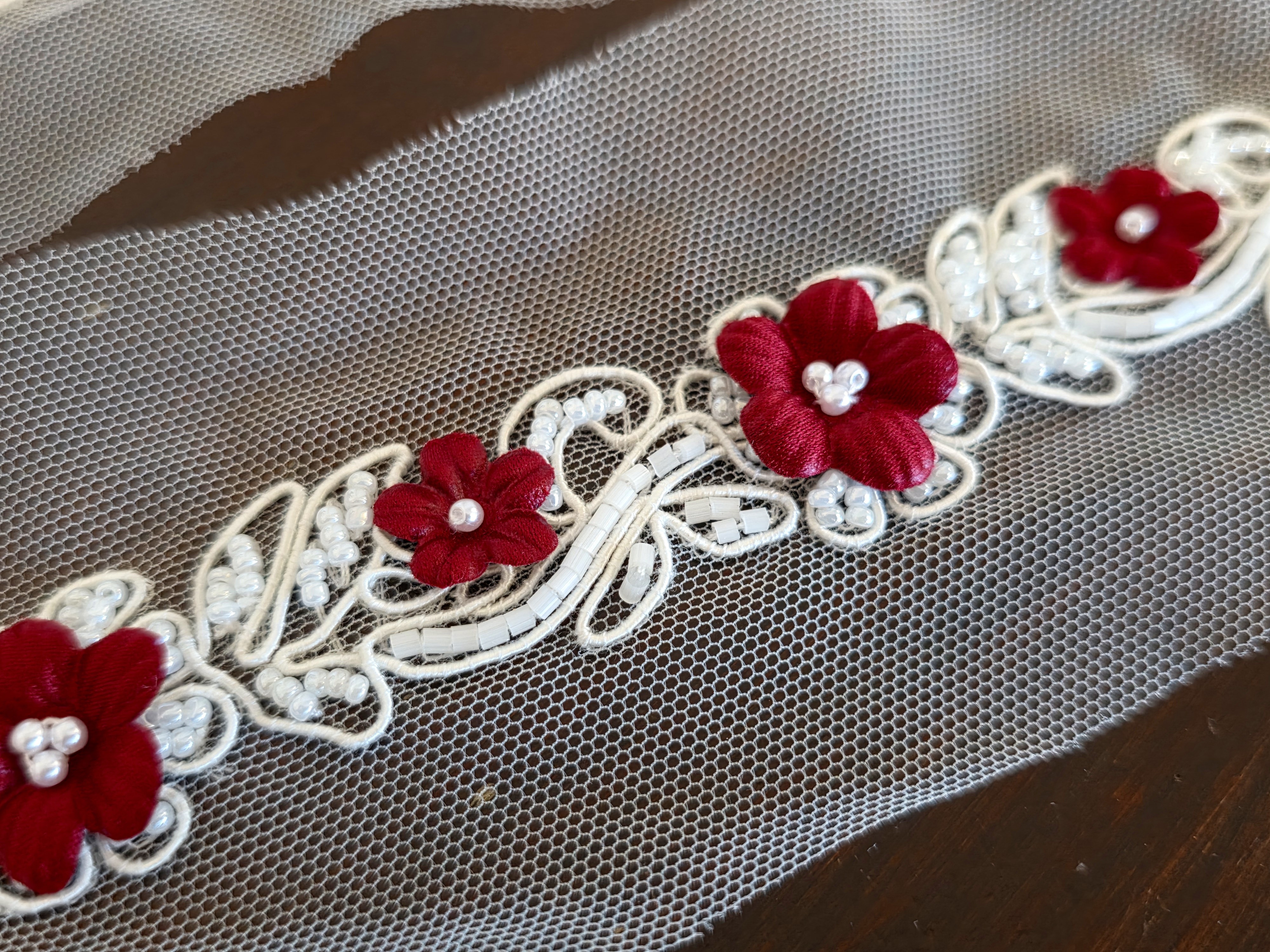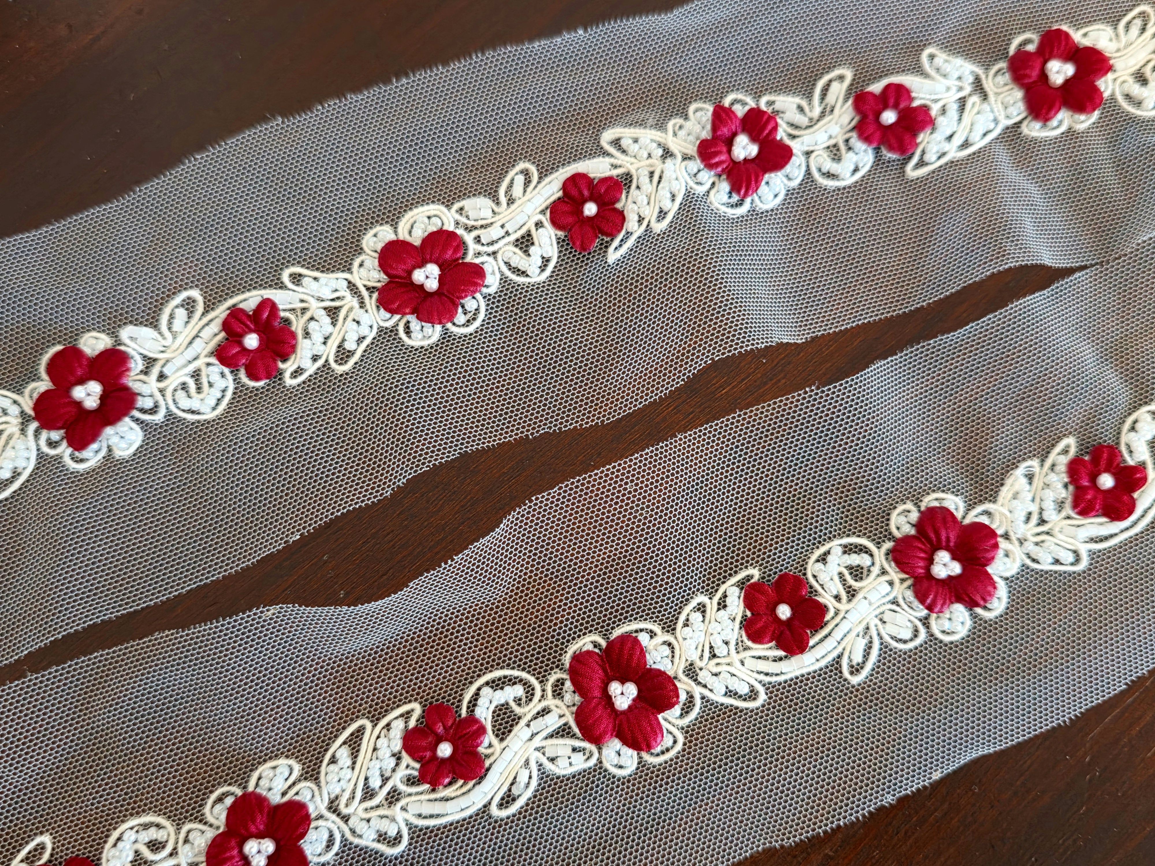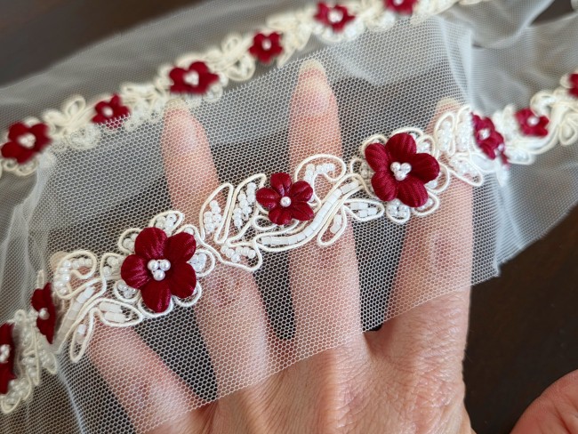 Composé de délicates fleurs bordeaux en relief, rehaussées de perles, et monté sur une base en tulle ivoire, ce galon offre un contraste raffiné et très tendance.