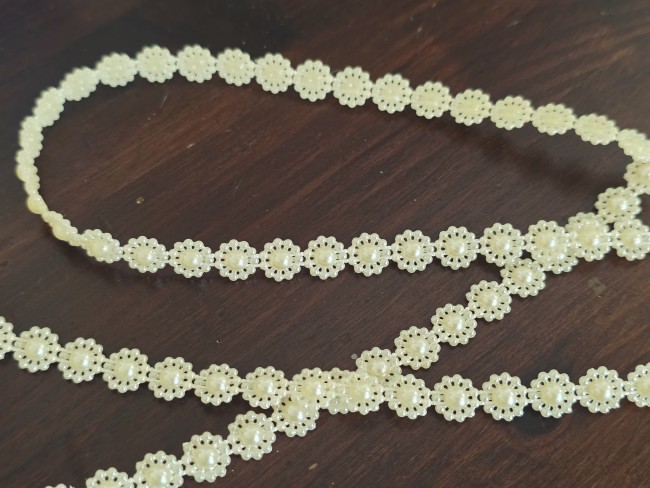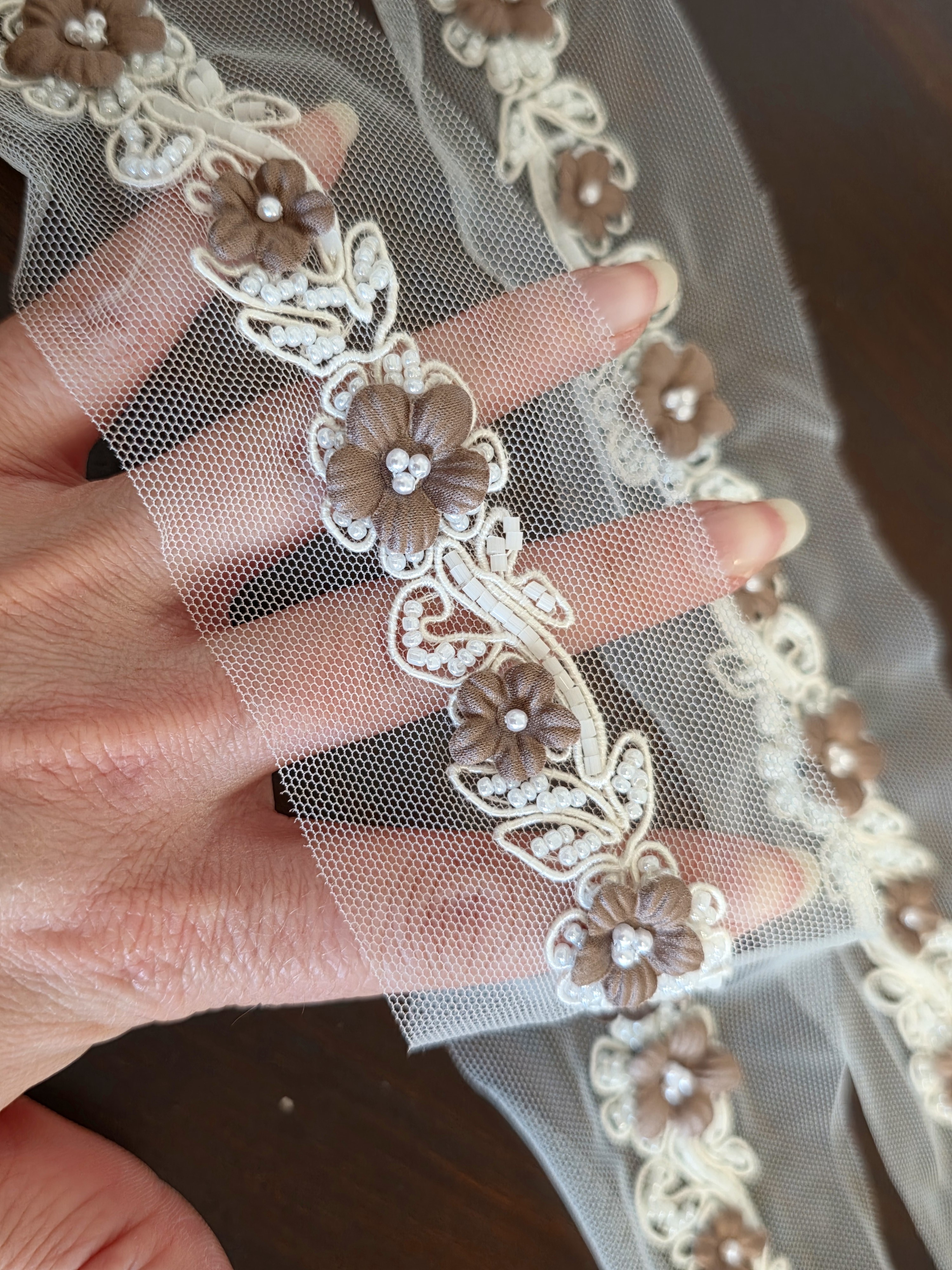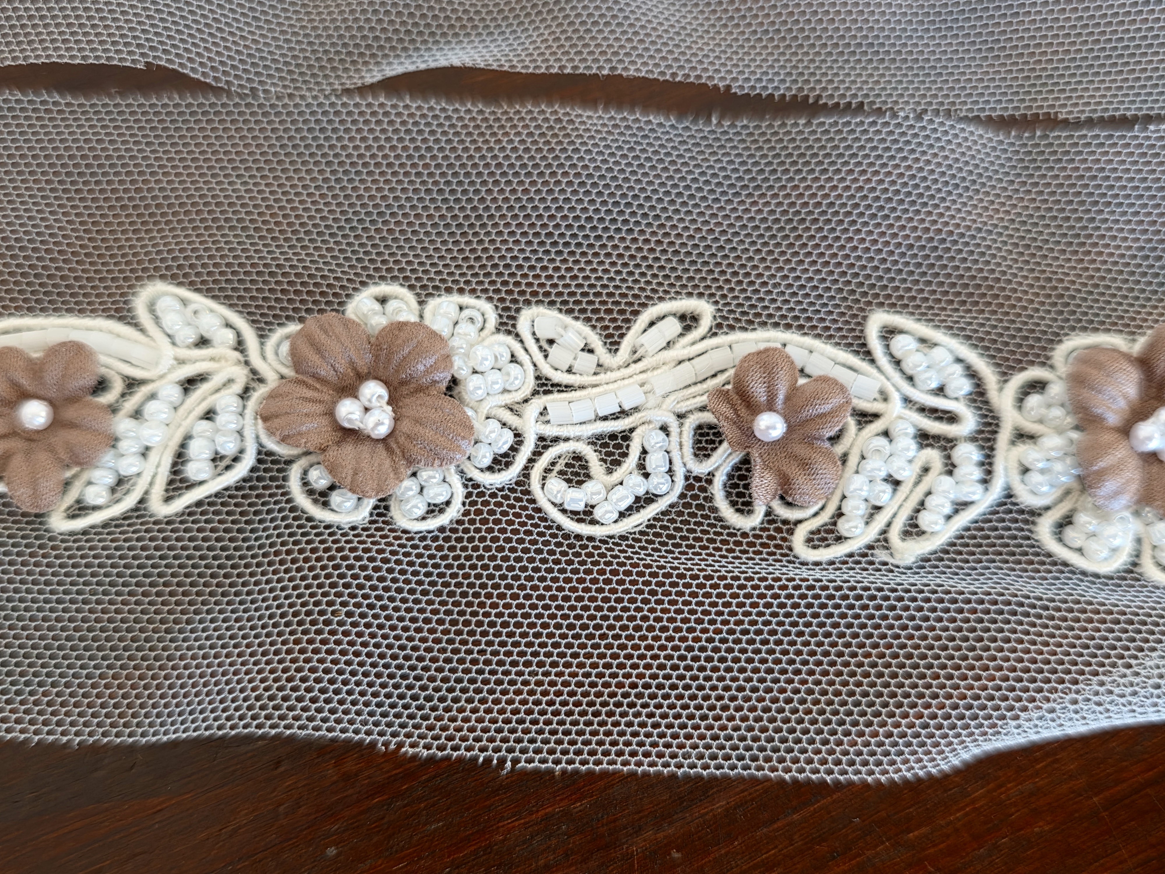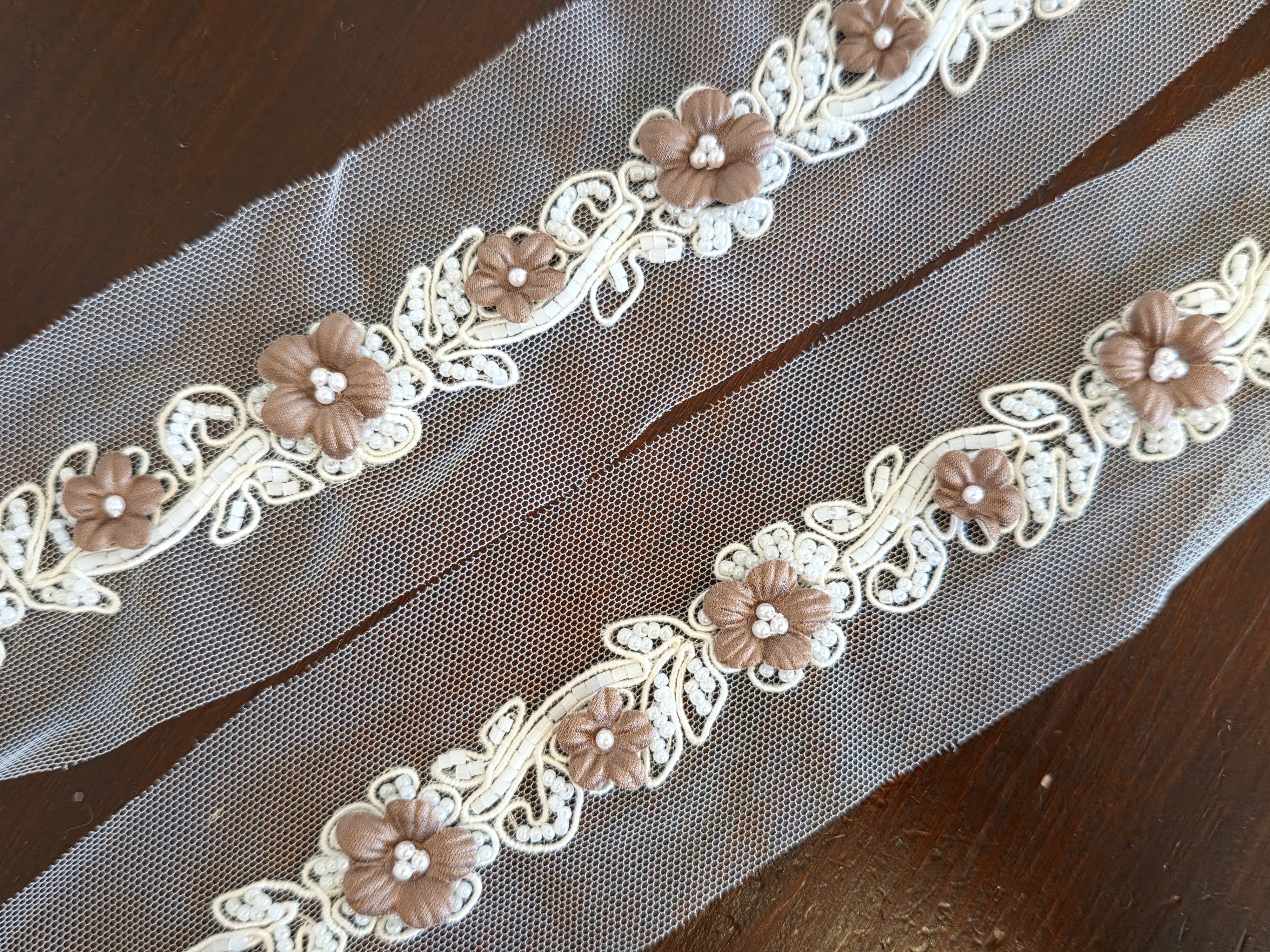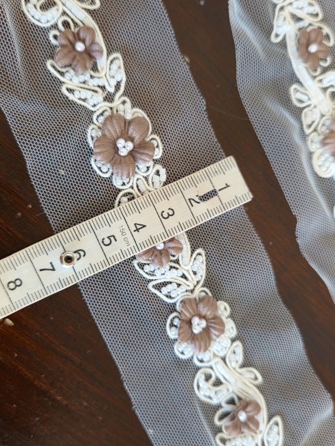 Composé de délicates fleurs brun chocolat en relief, rehaussées de perles, et monté sur une base en tulle ivoire, ce galon offre un contraste chic et chaleureux.