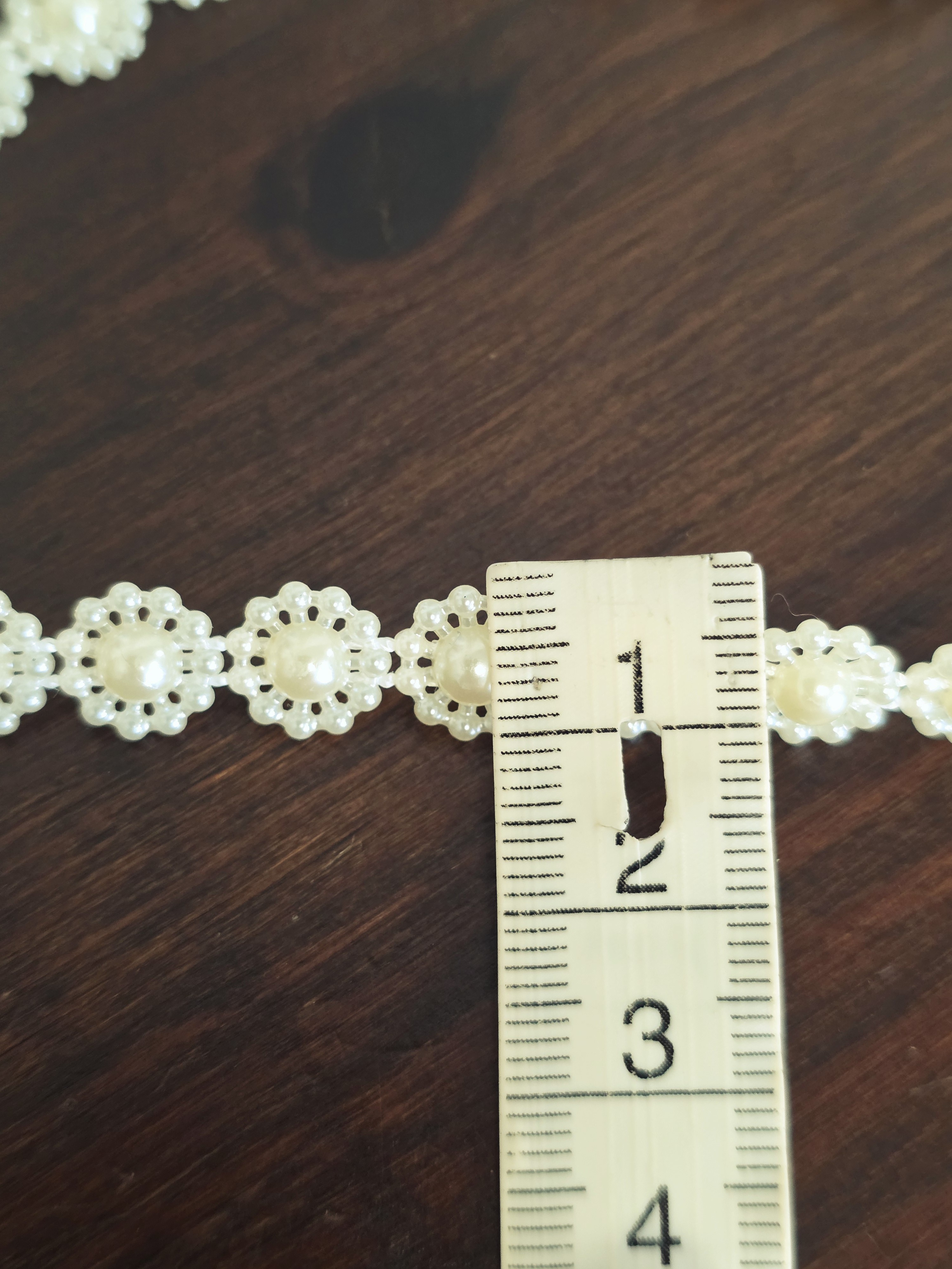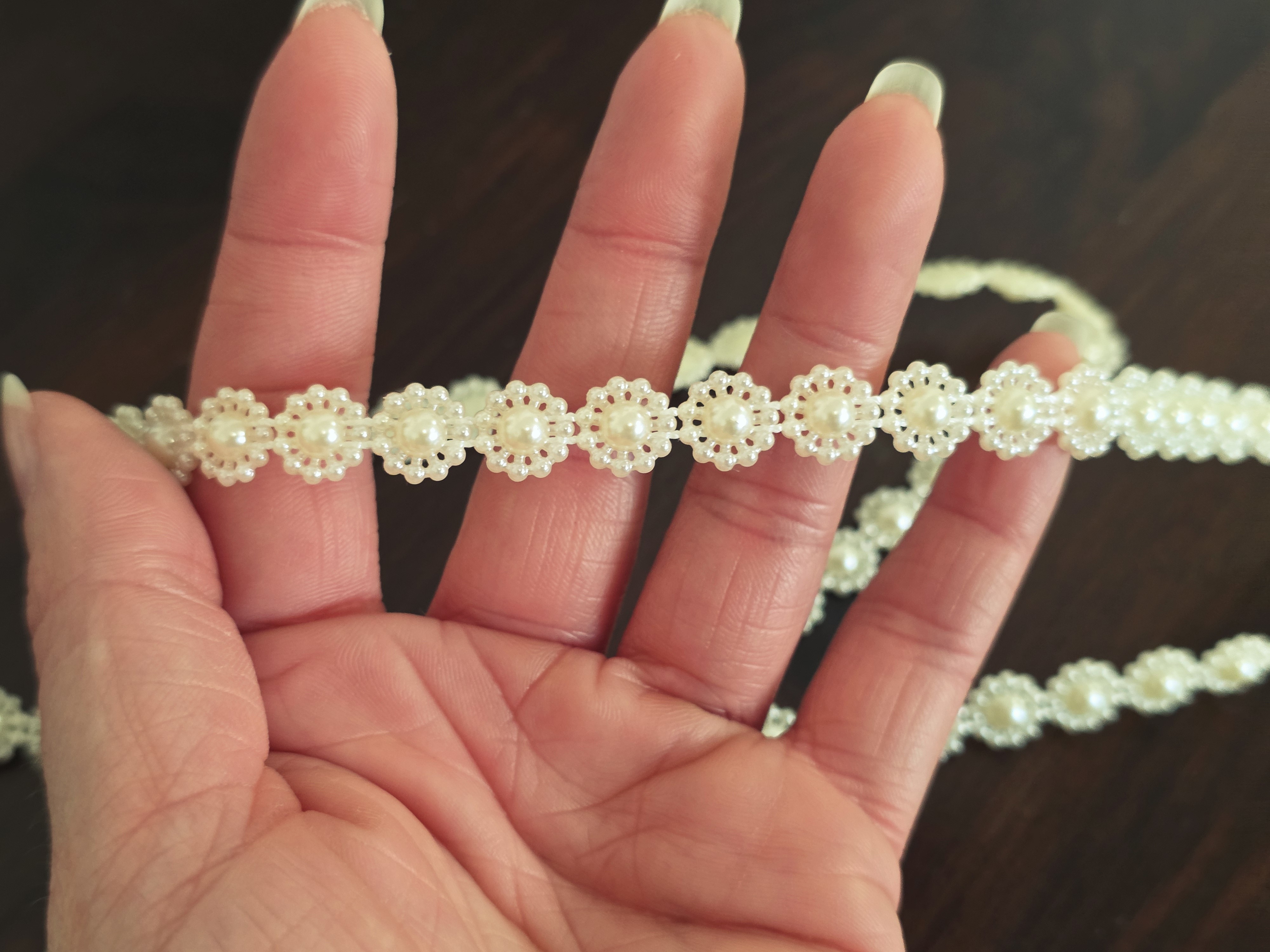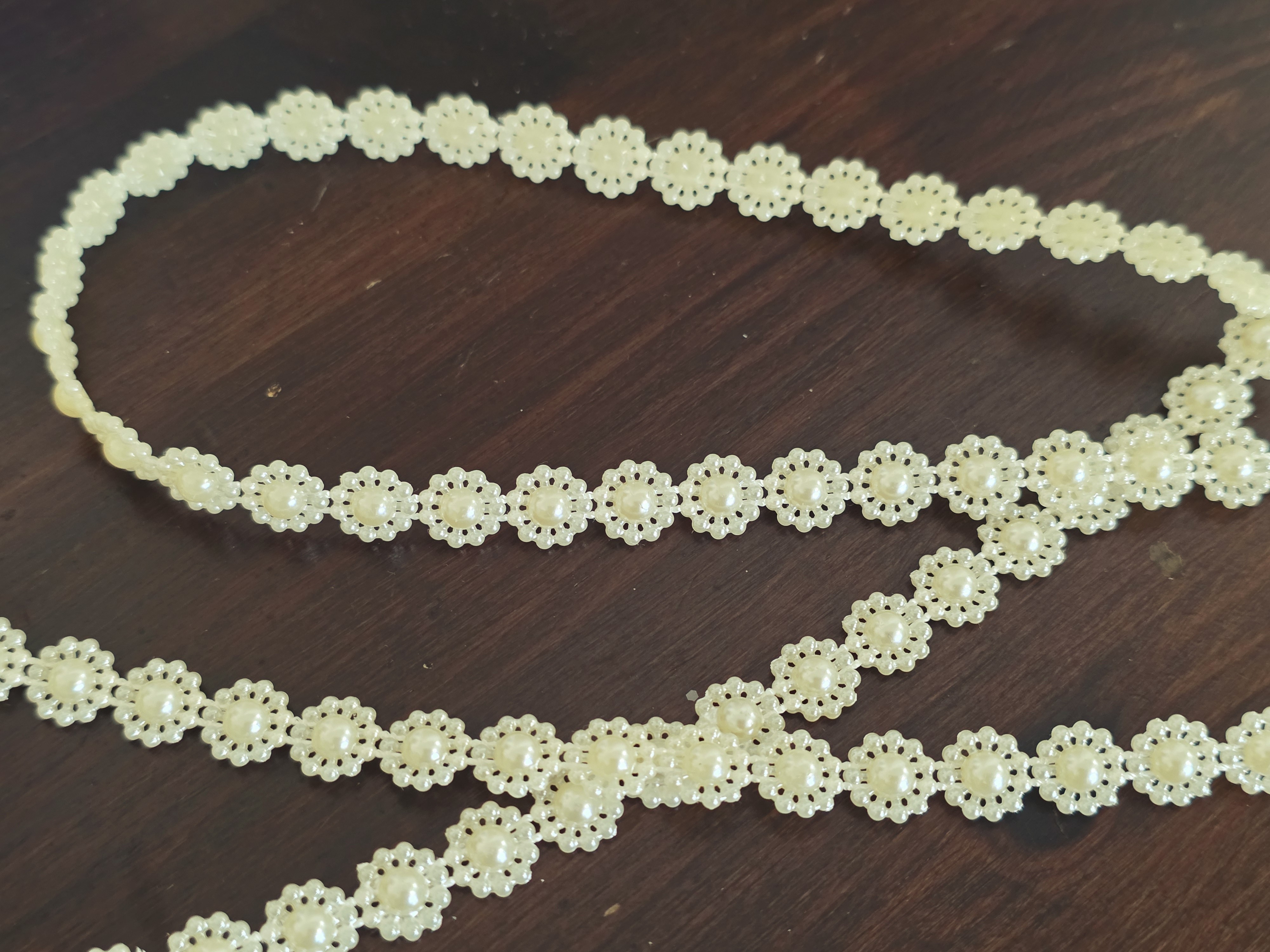 Apportez une touche d’élégance intemporelle à vos créations avec ce galon composé de petites fleurs en perles ivoire crème.