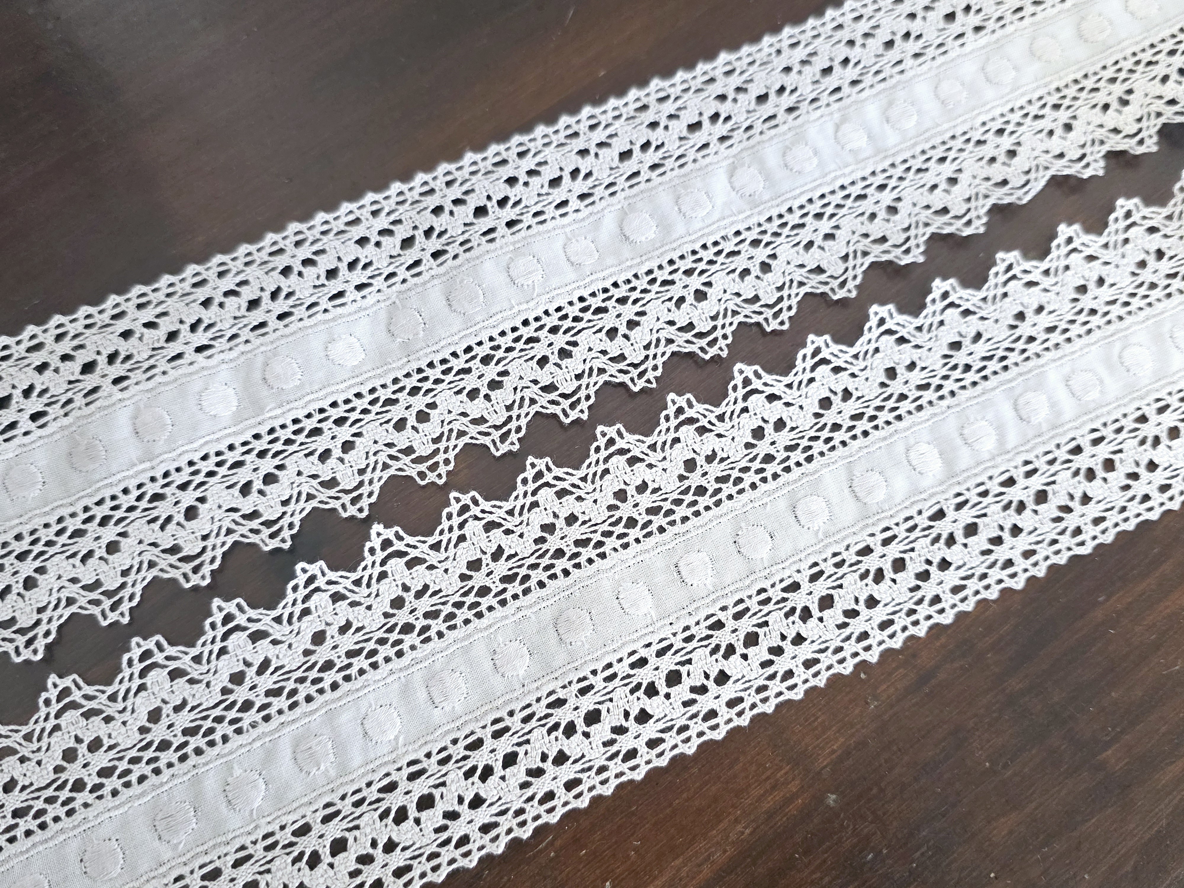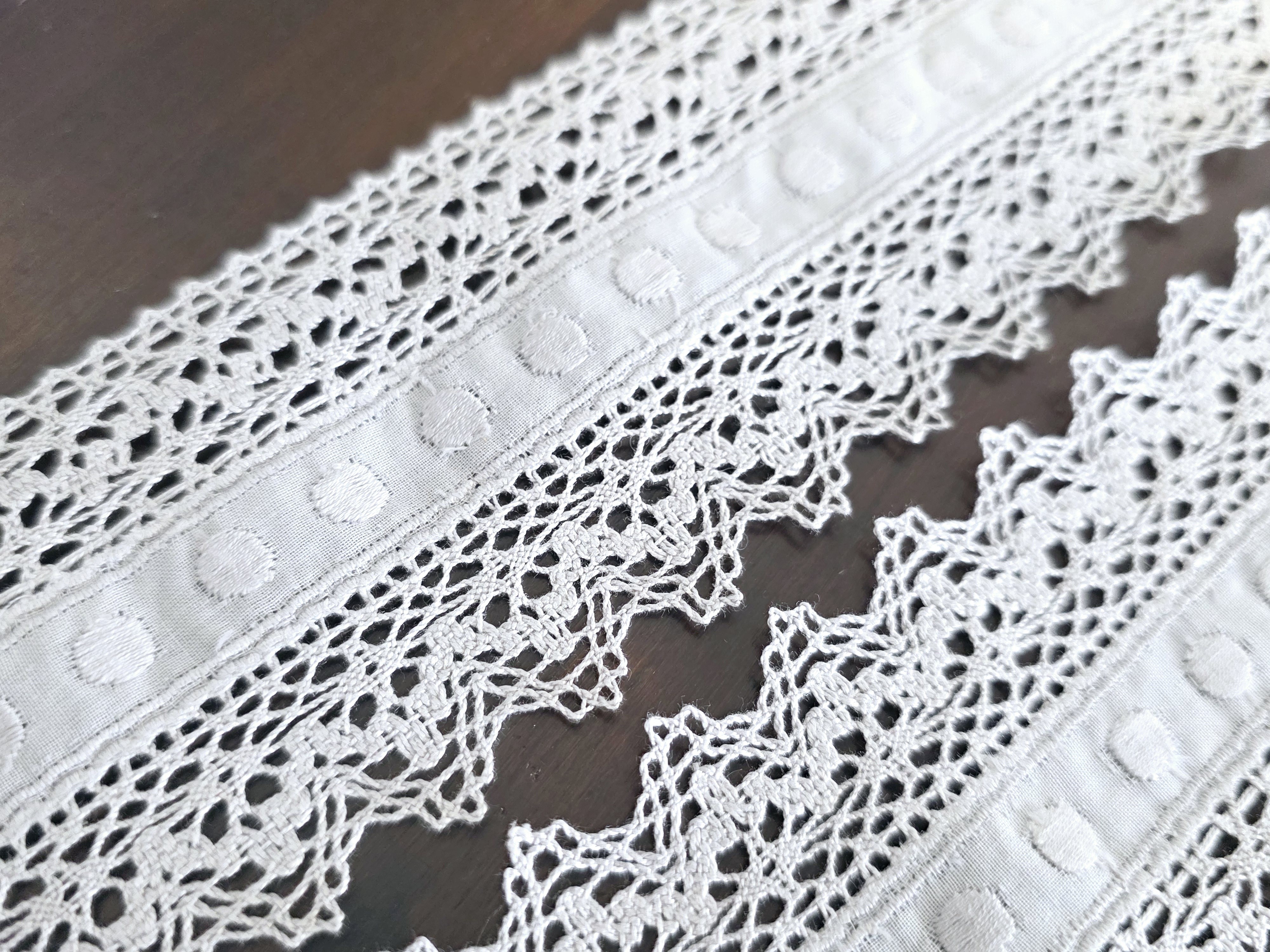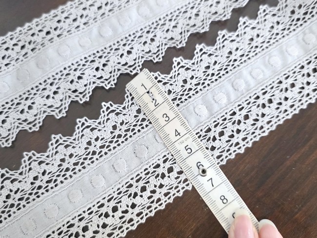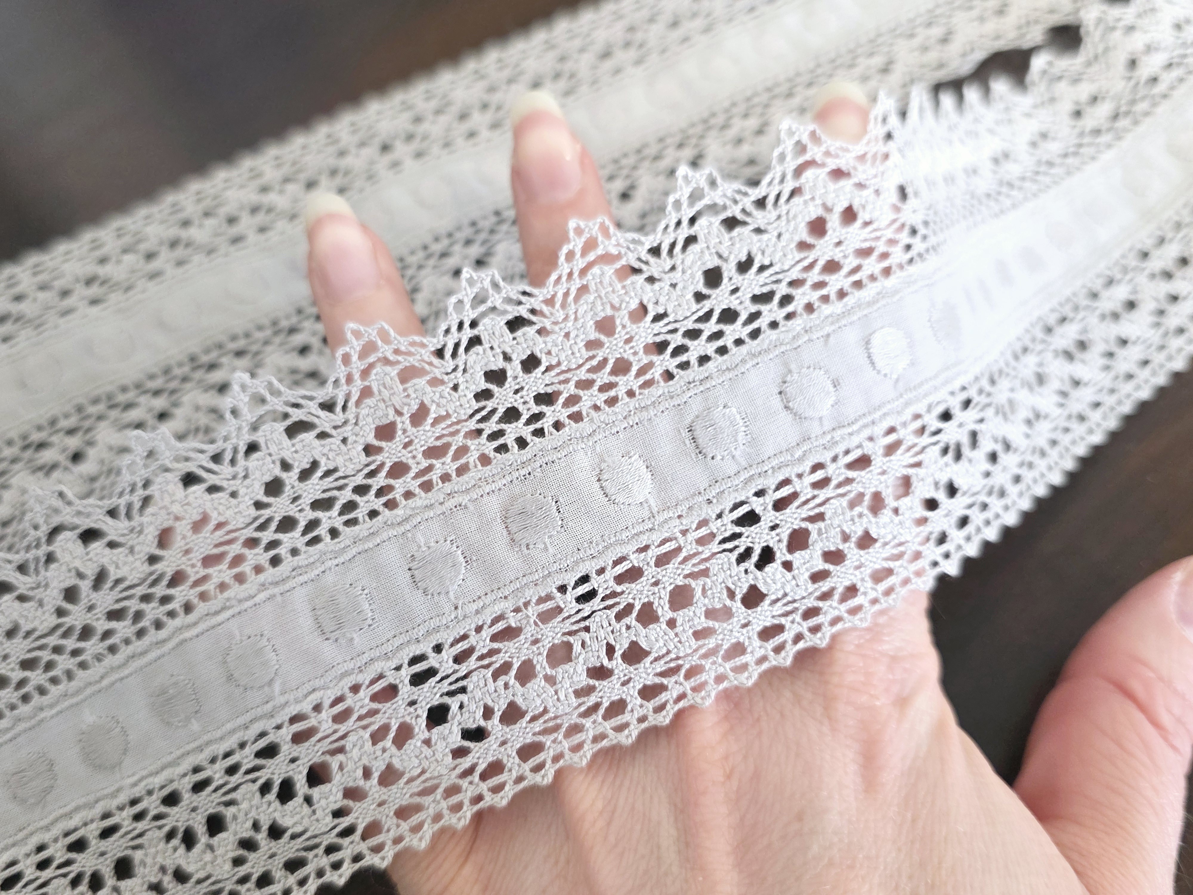 Composé d’une bande centrale en coton brodé et entouré d’une dentelle fine ajourée, il offre un rendu délicat et légèrement vintage.