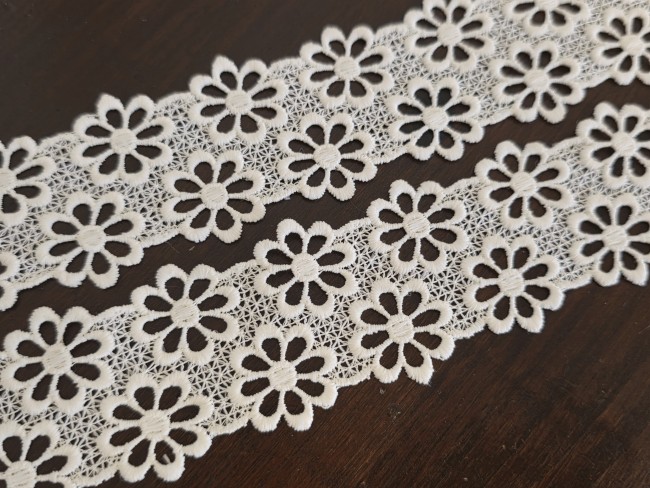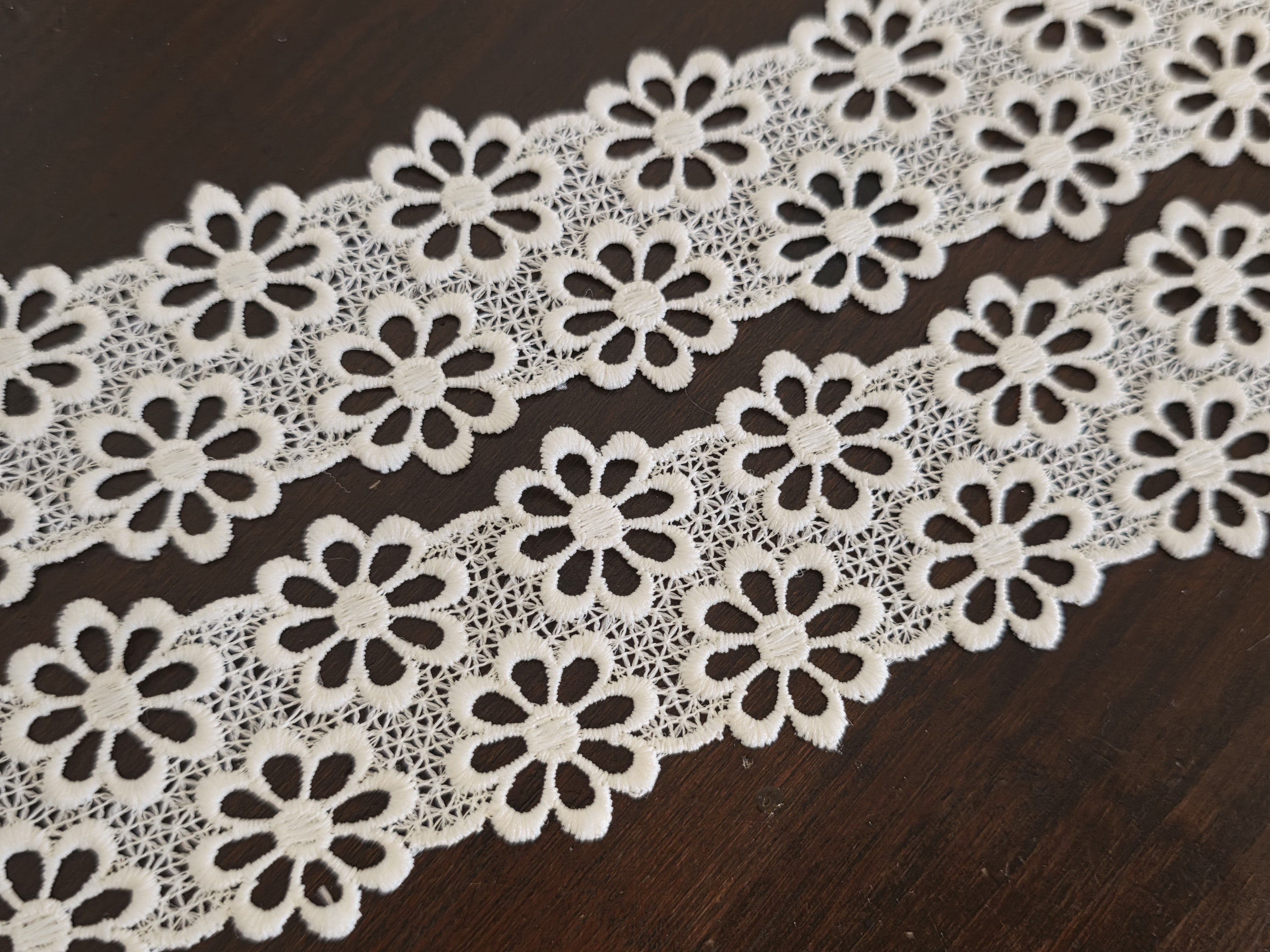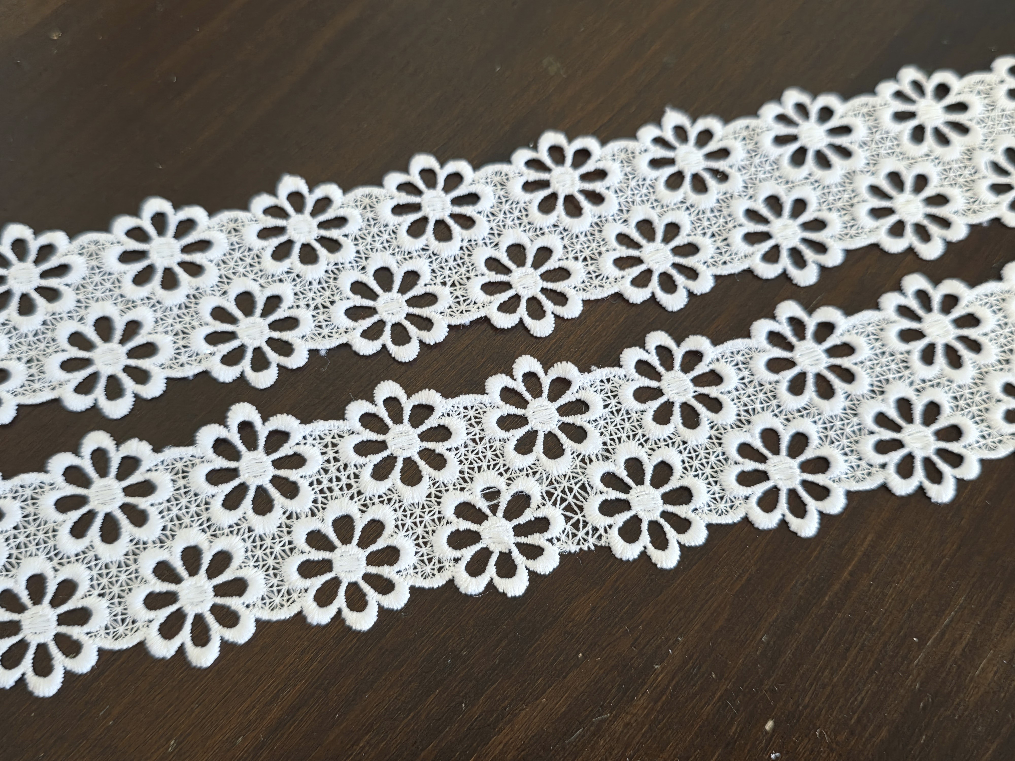 Craquez pour ce galon de dentelle au motif marguerite, idéal pour apporter une finition délicate et lumineuse à vos créations.