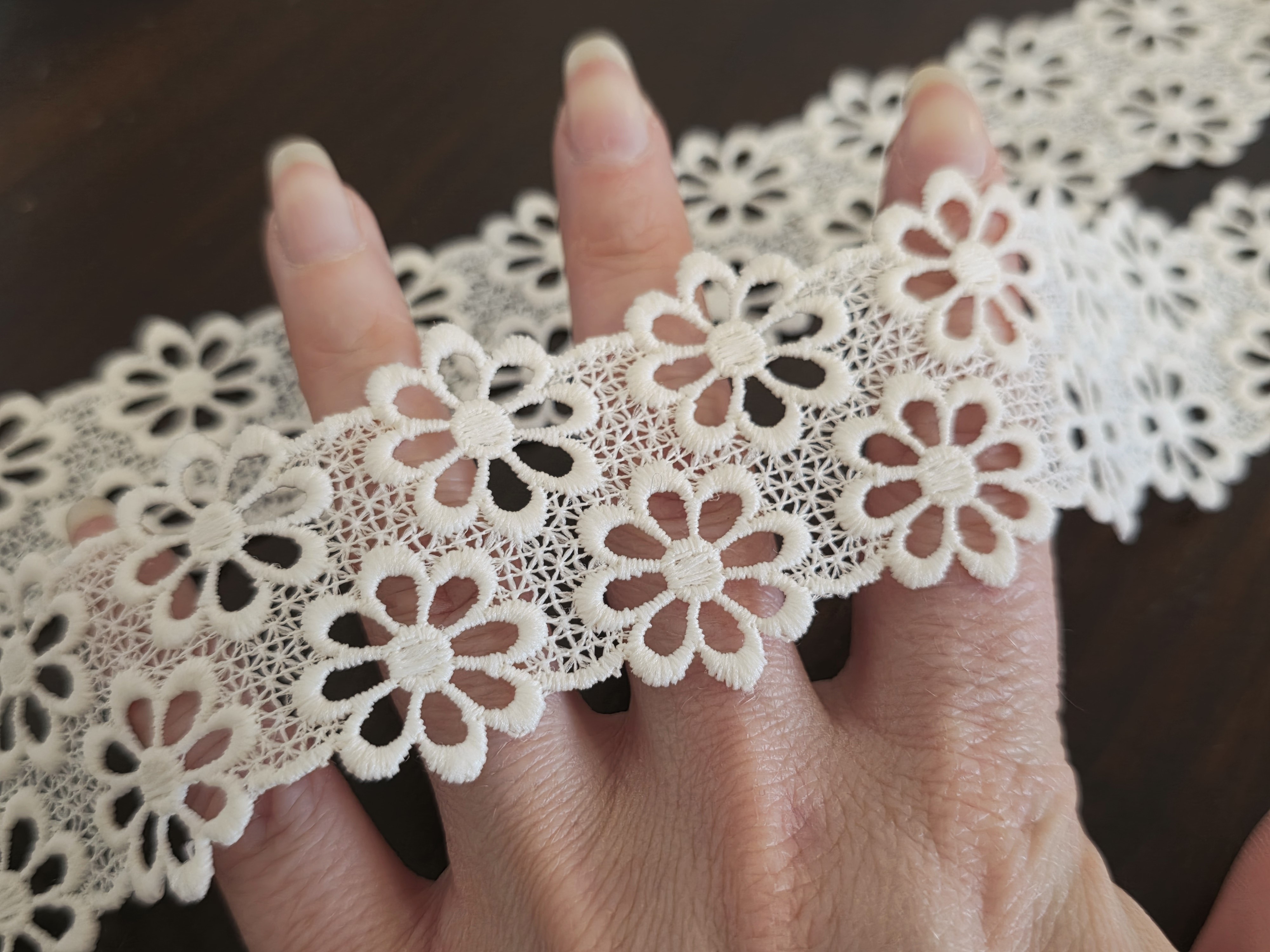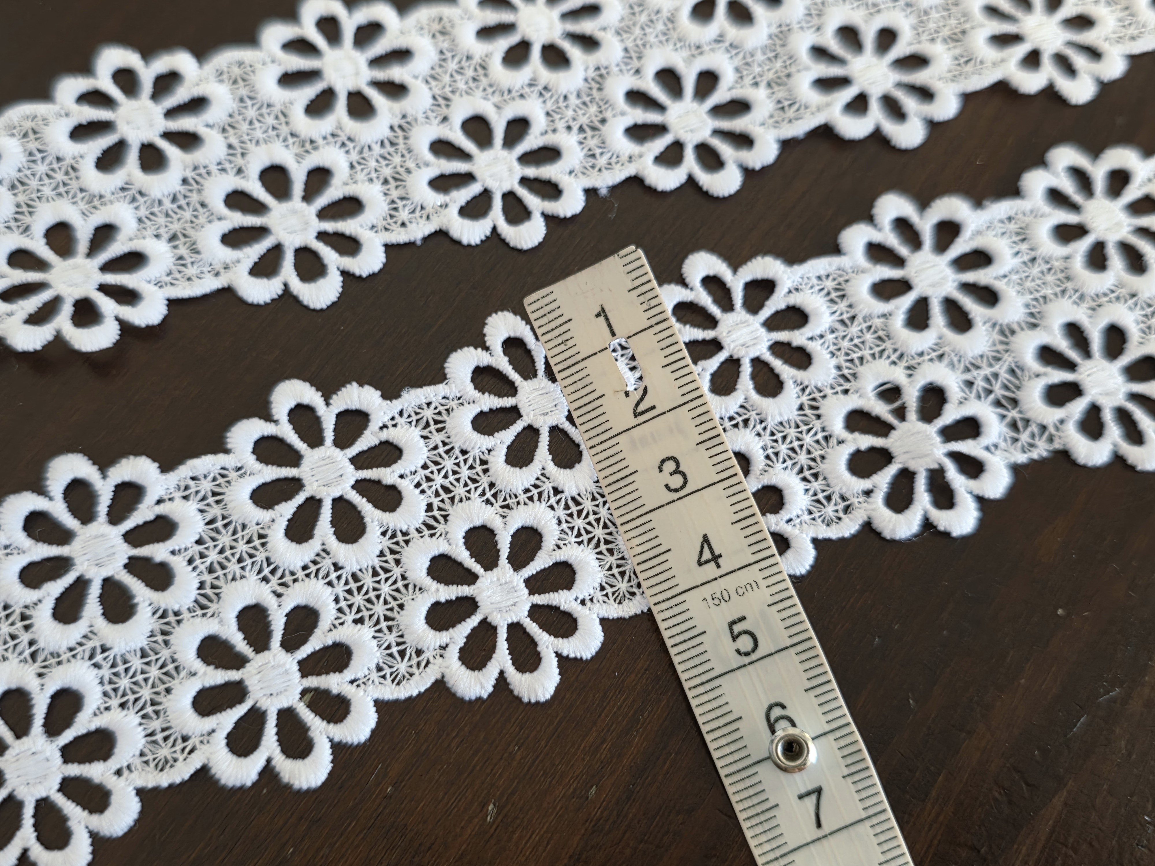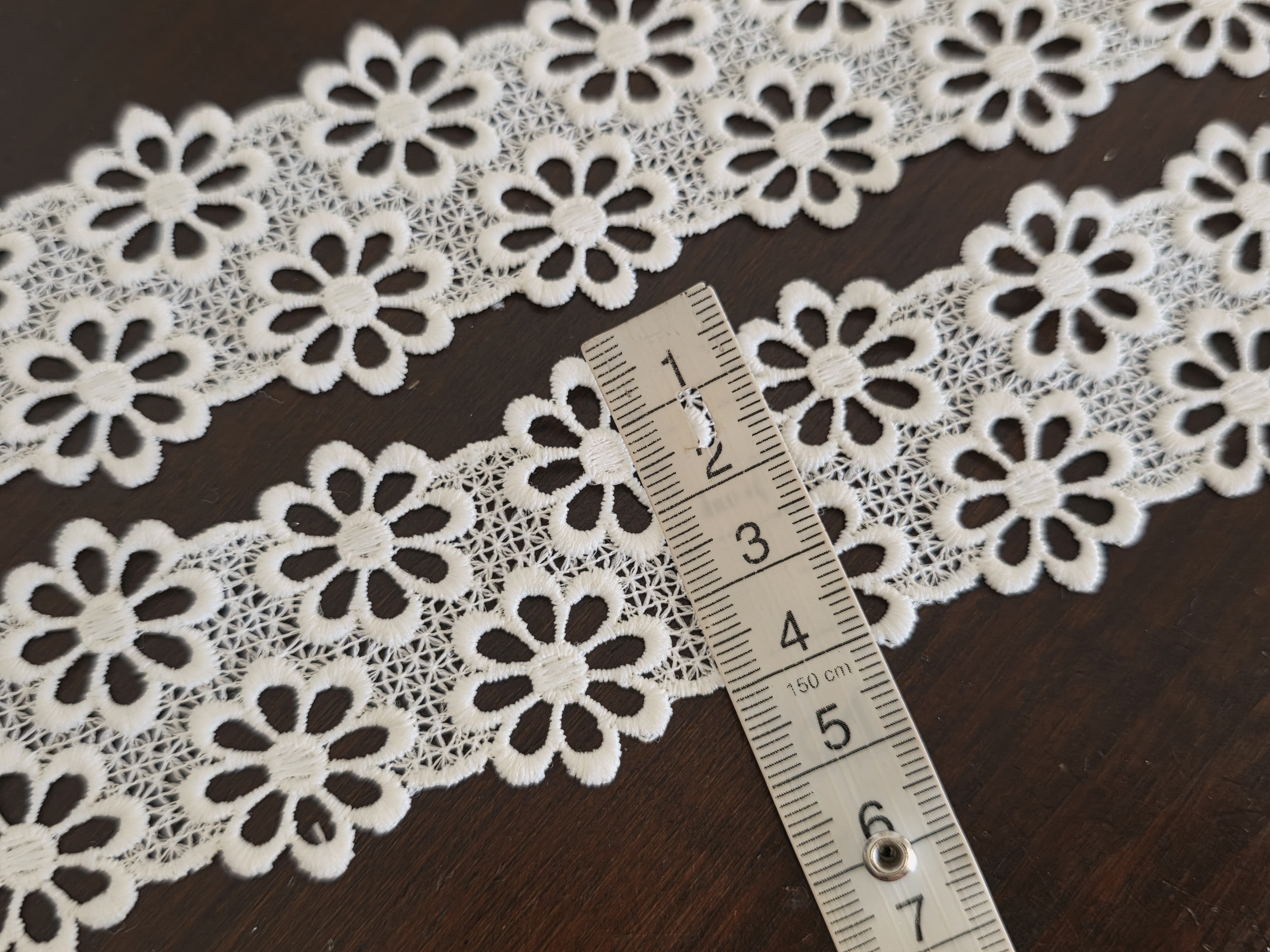 Craquez pour ce galon de dentelle au motif marguerite, idéal pour apporter une finition délicate et lumineuse à vos créations.