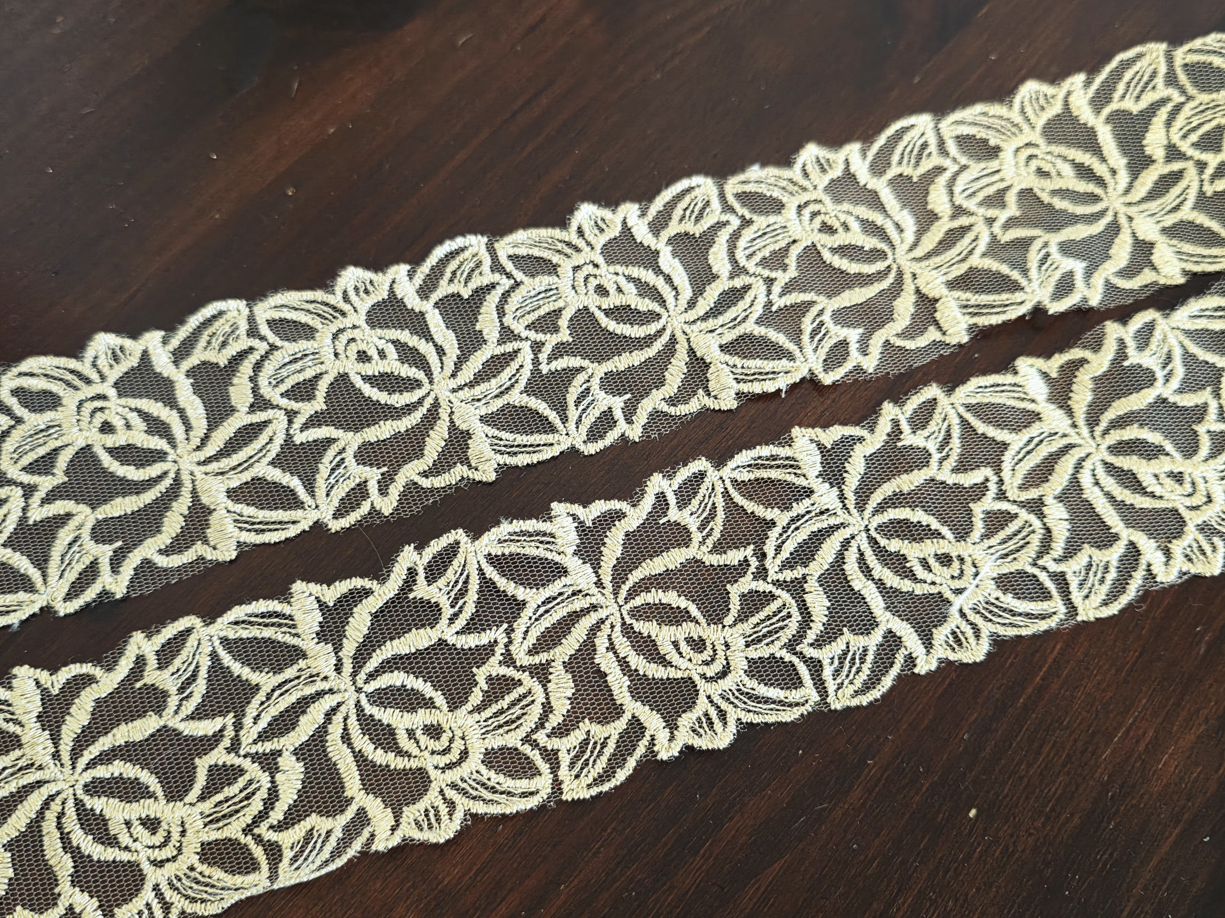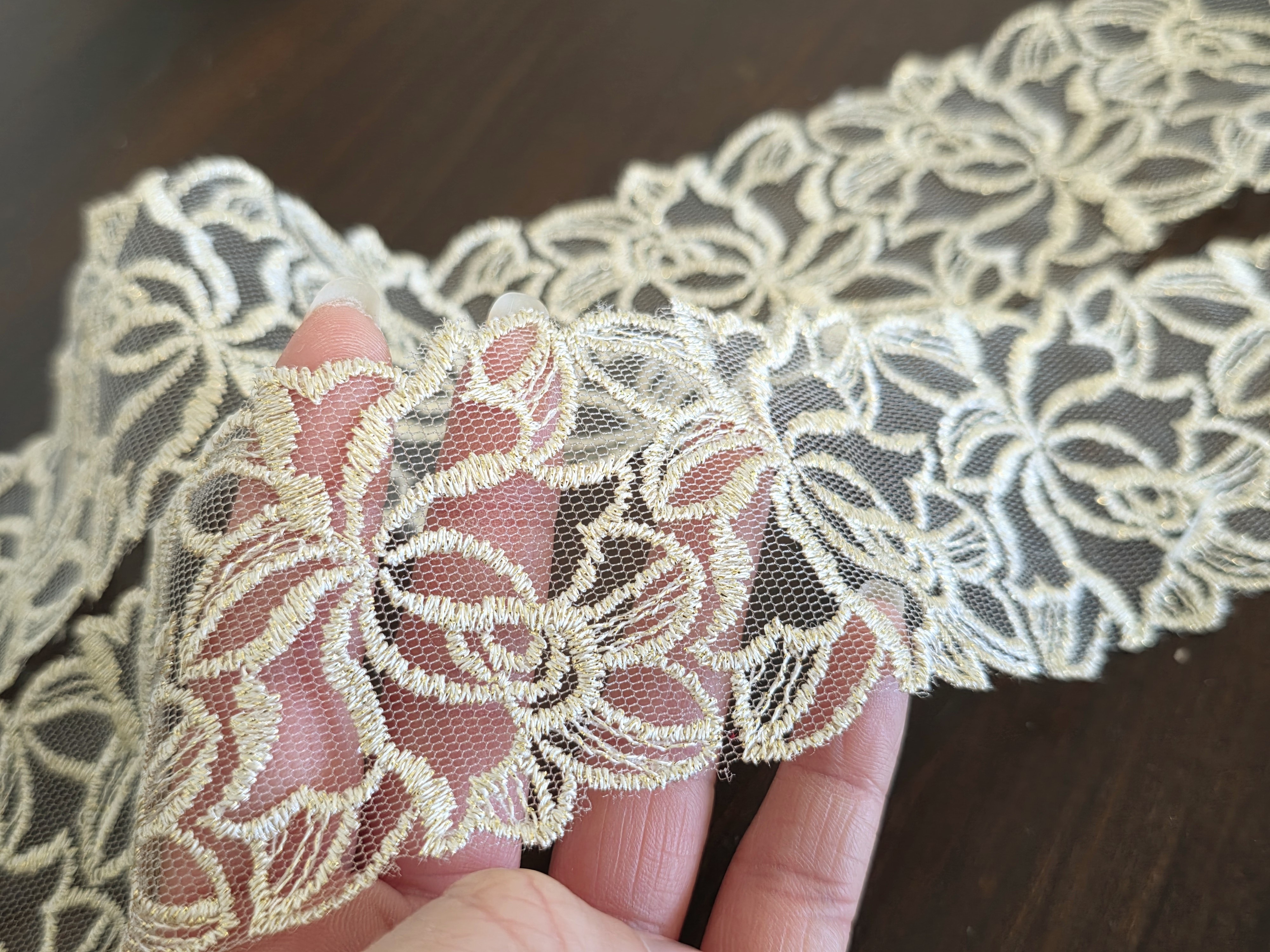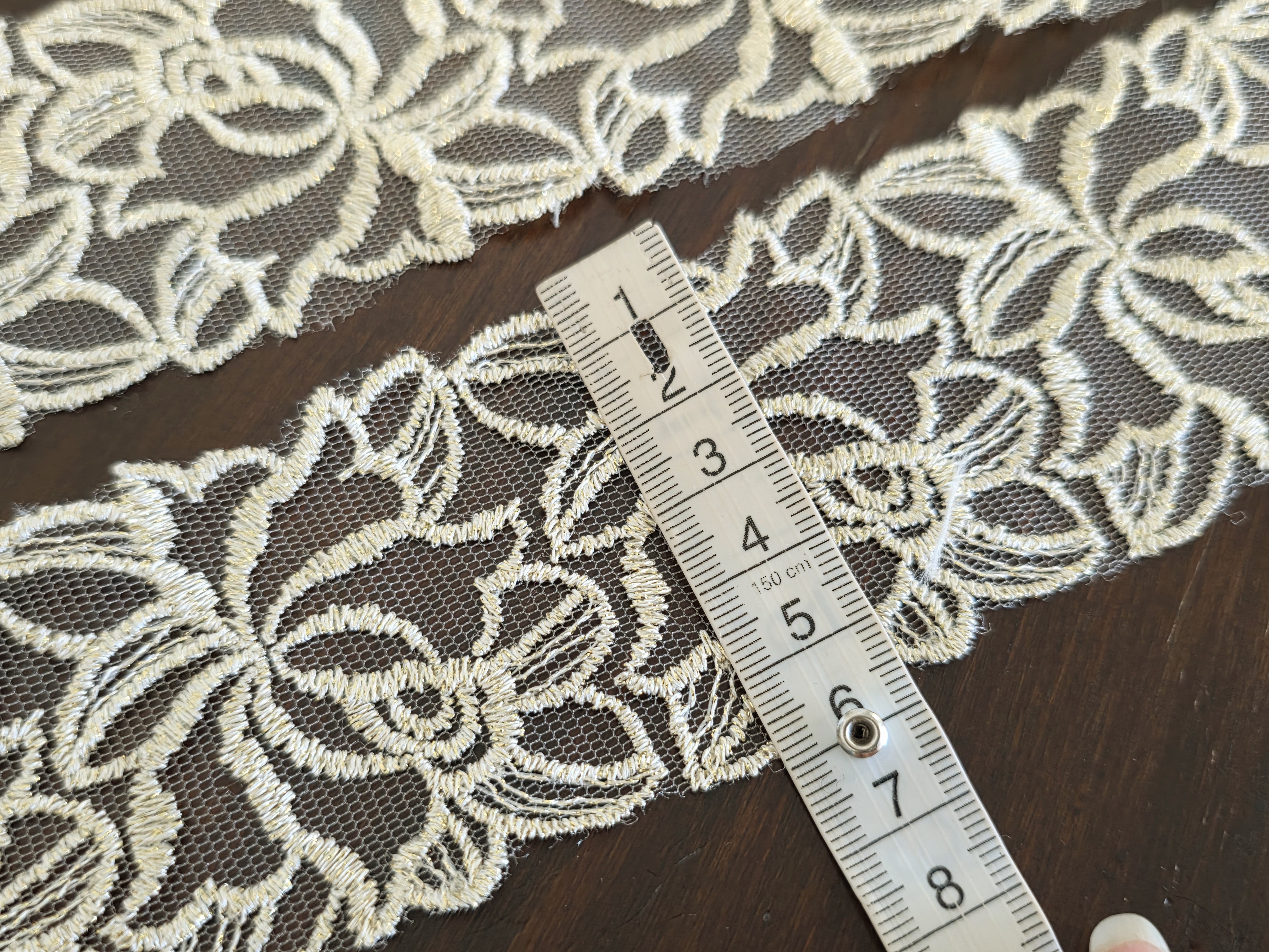 Mettez en valeur vos créations avec ce galon de dentelle doré au rendu lumineux et raffiné.
