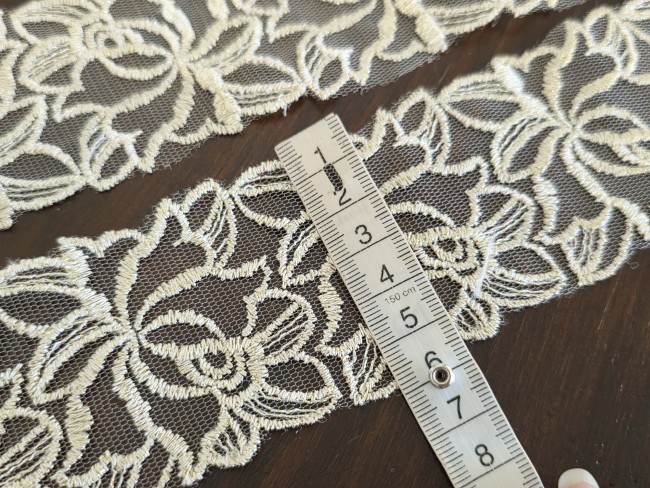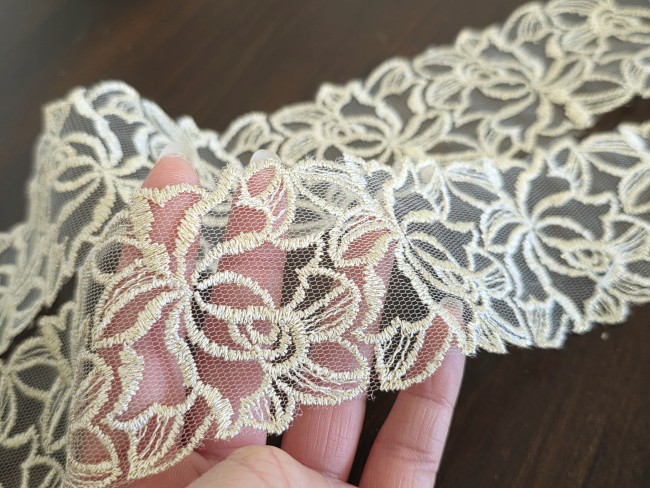 Son motif floral brodé, associé à des fils métallisés, capte la lumière et apporte une touche élégante et sophistiquée. Monté sur un tulle fin, il reste léger tout en offrant un effet visuel riche.