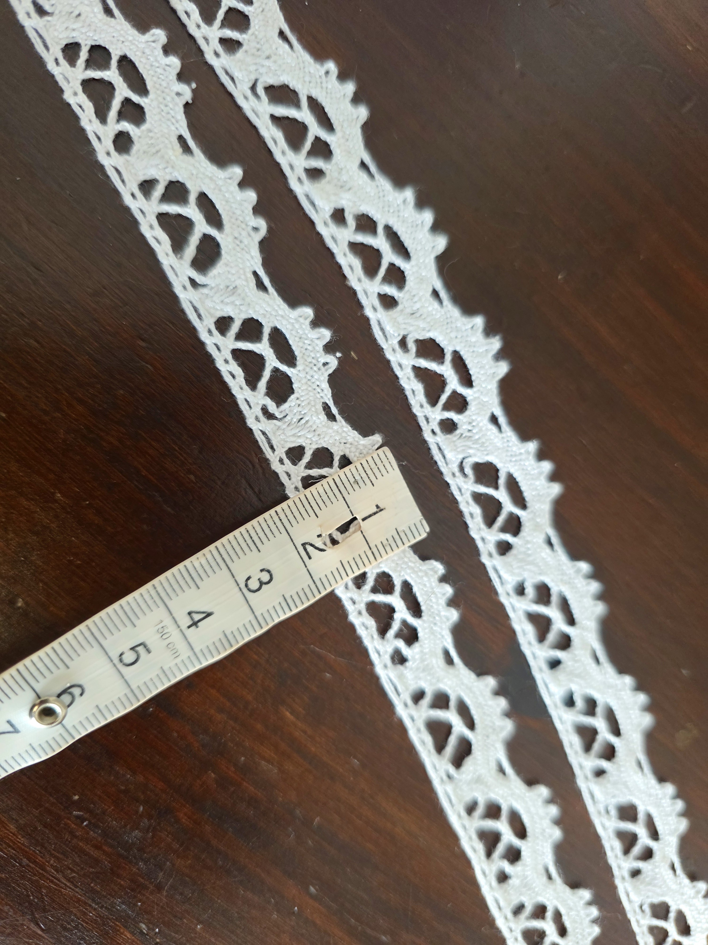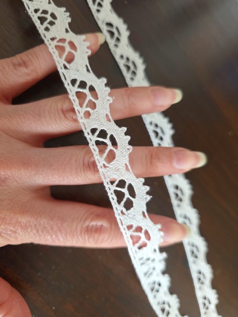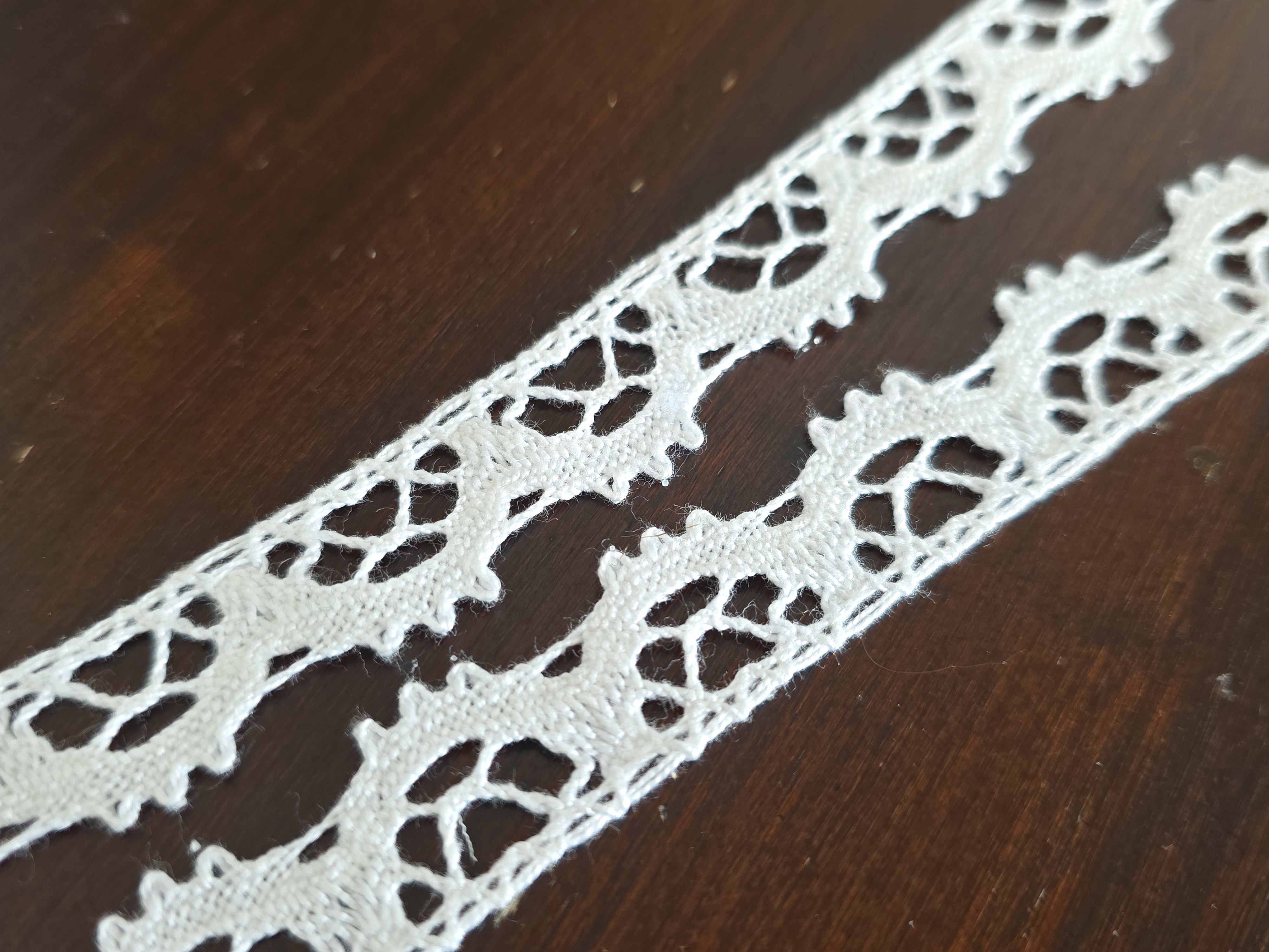 Ce galon fin en dentelle ivoire se distingue par son motif ajouré et son style légèrement vintage, parfait pour des finitions discrètes et élégantes.