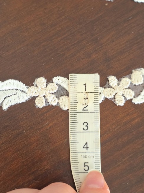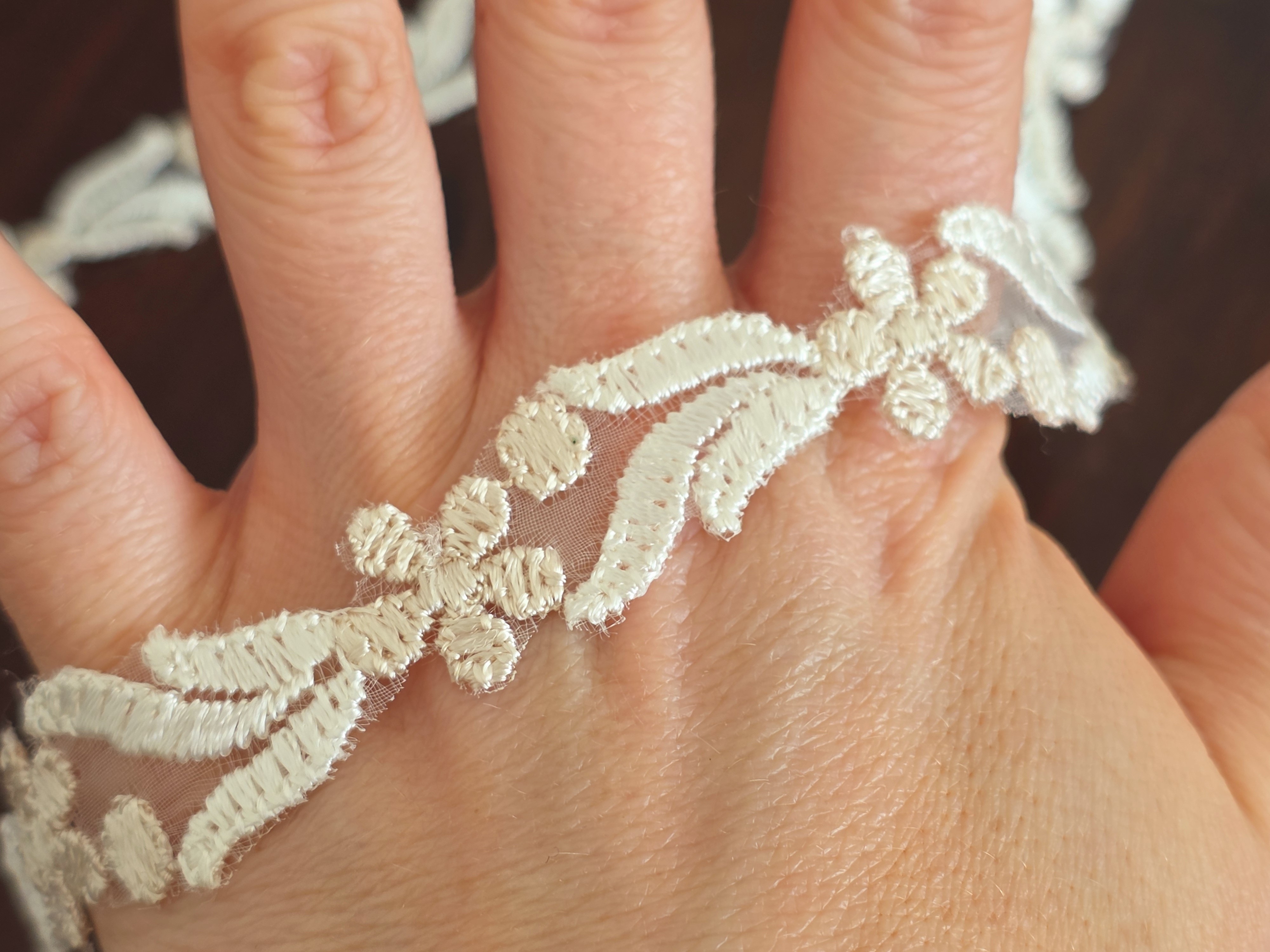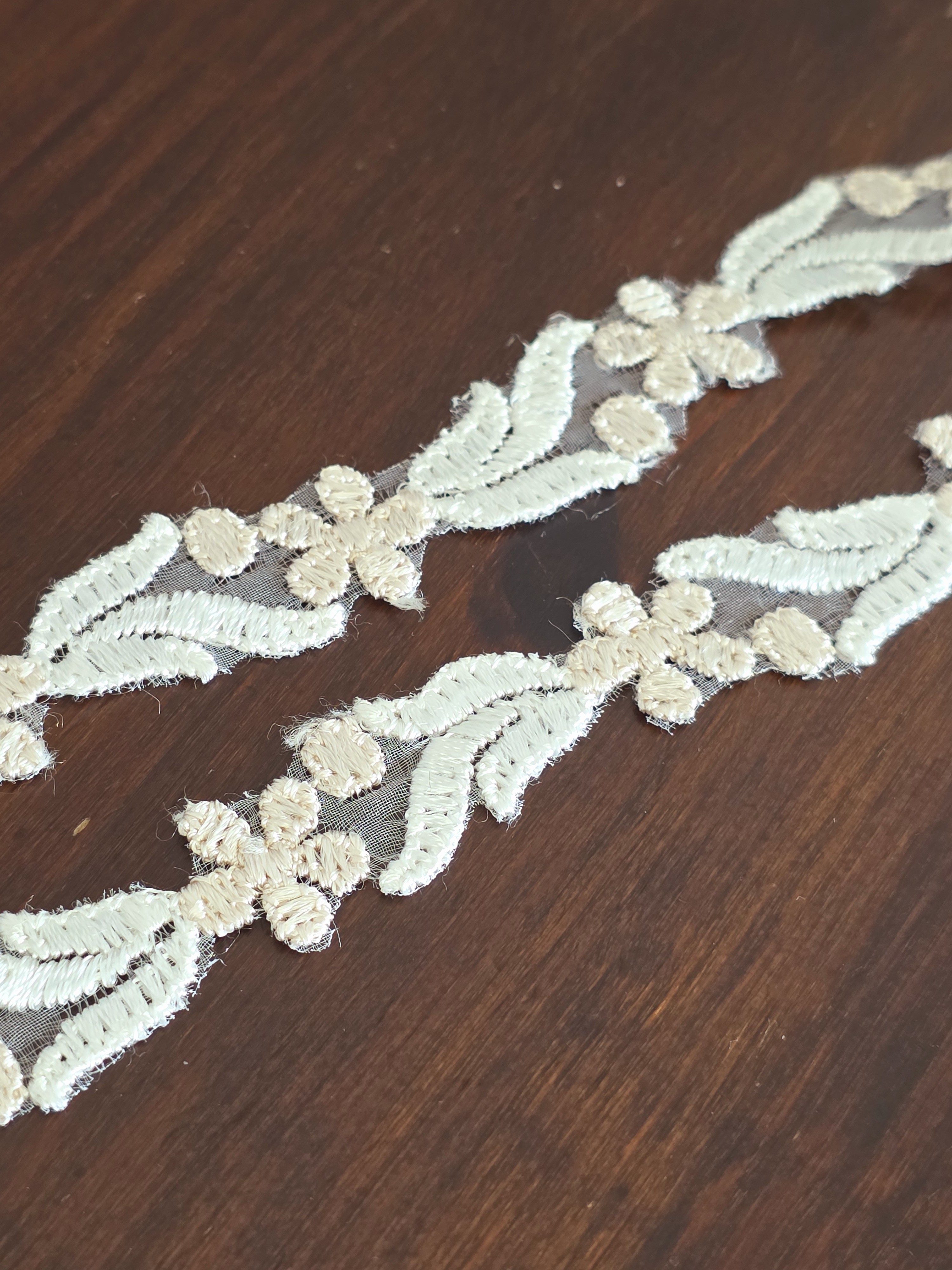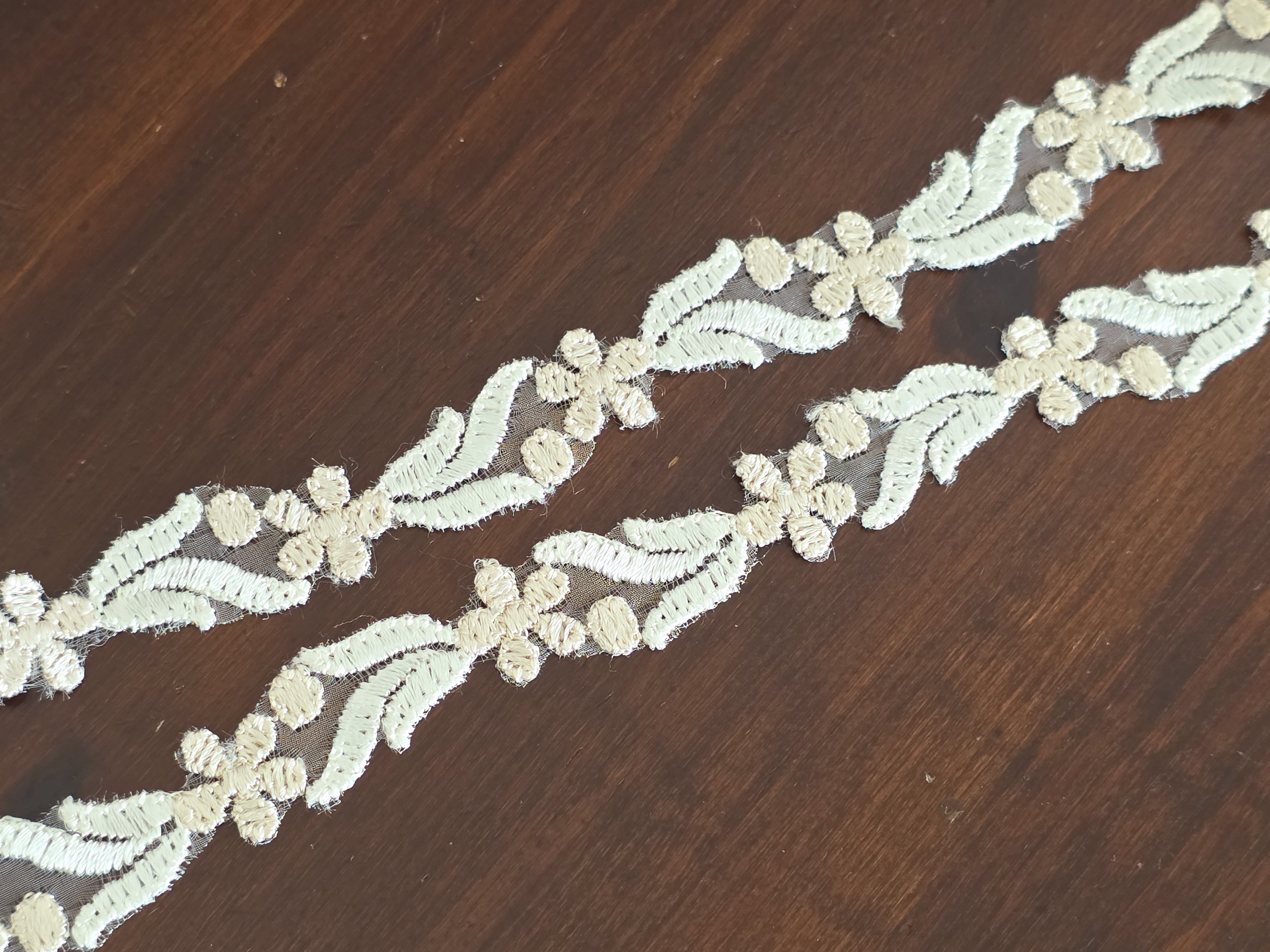 Galon en dentelle brodée sur tulle d’environ 2 cm de largeur au motif floral délicat en bicolore ivoire et nude pour un rendu doux et raffiné
