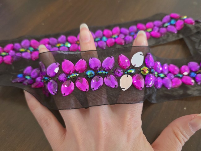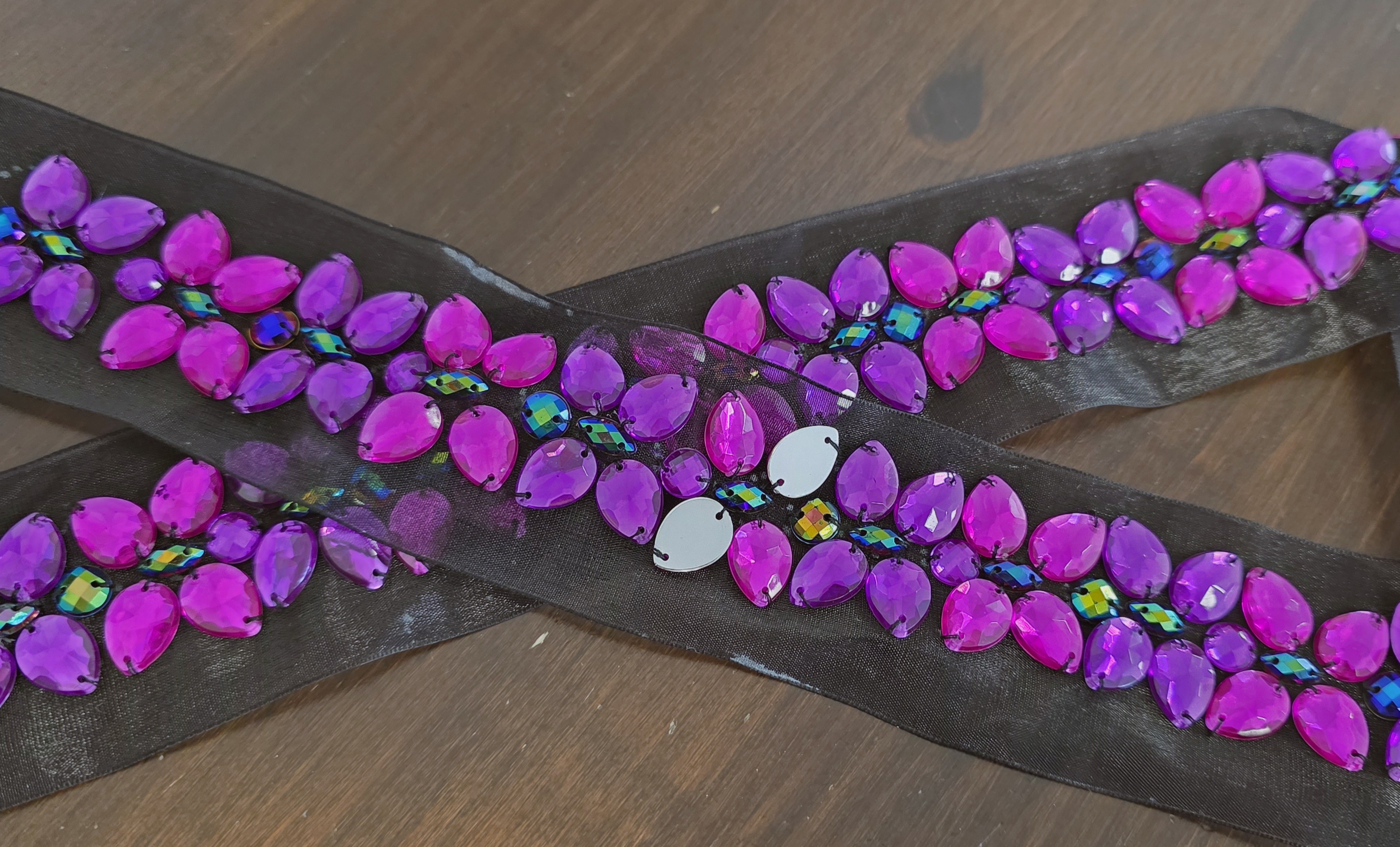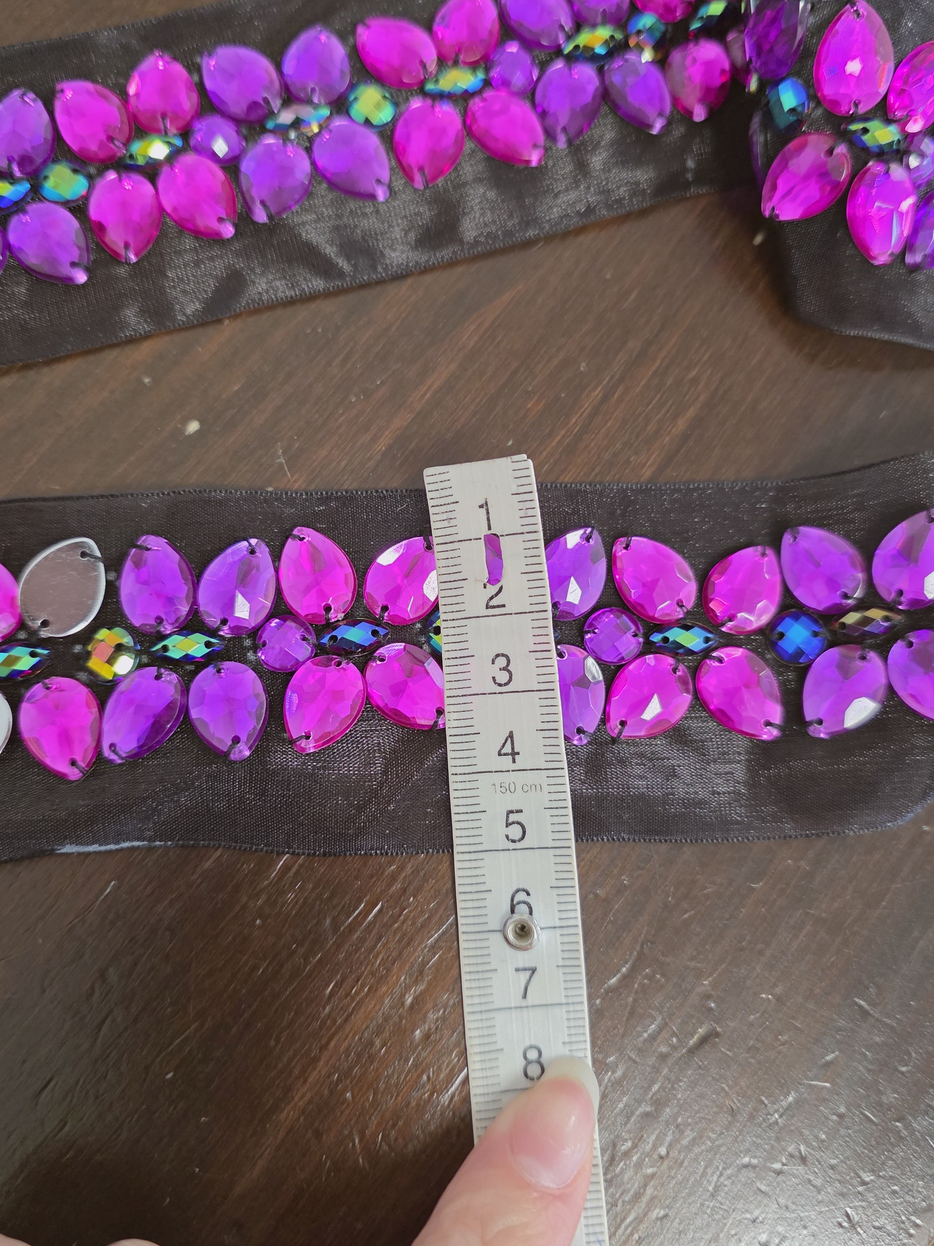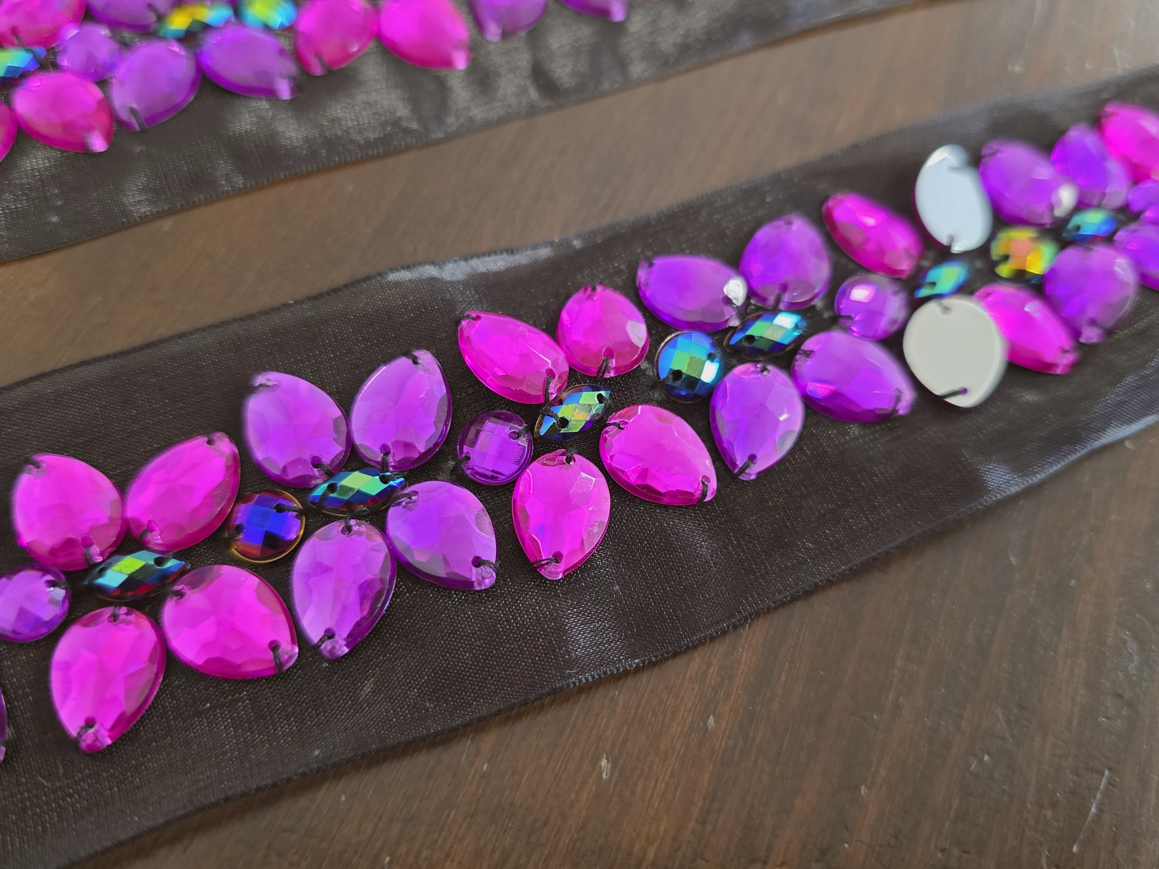 Galon bijou monté sur tulle noir d’environ 5 cm de largeur orné de strass et pierres facettées aux tons rose fuchsia et reflets irisés pour un effet lumineux et spectaculaire